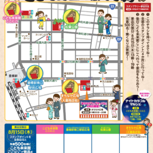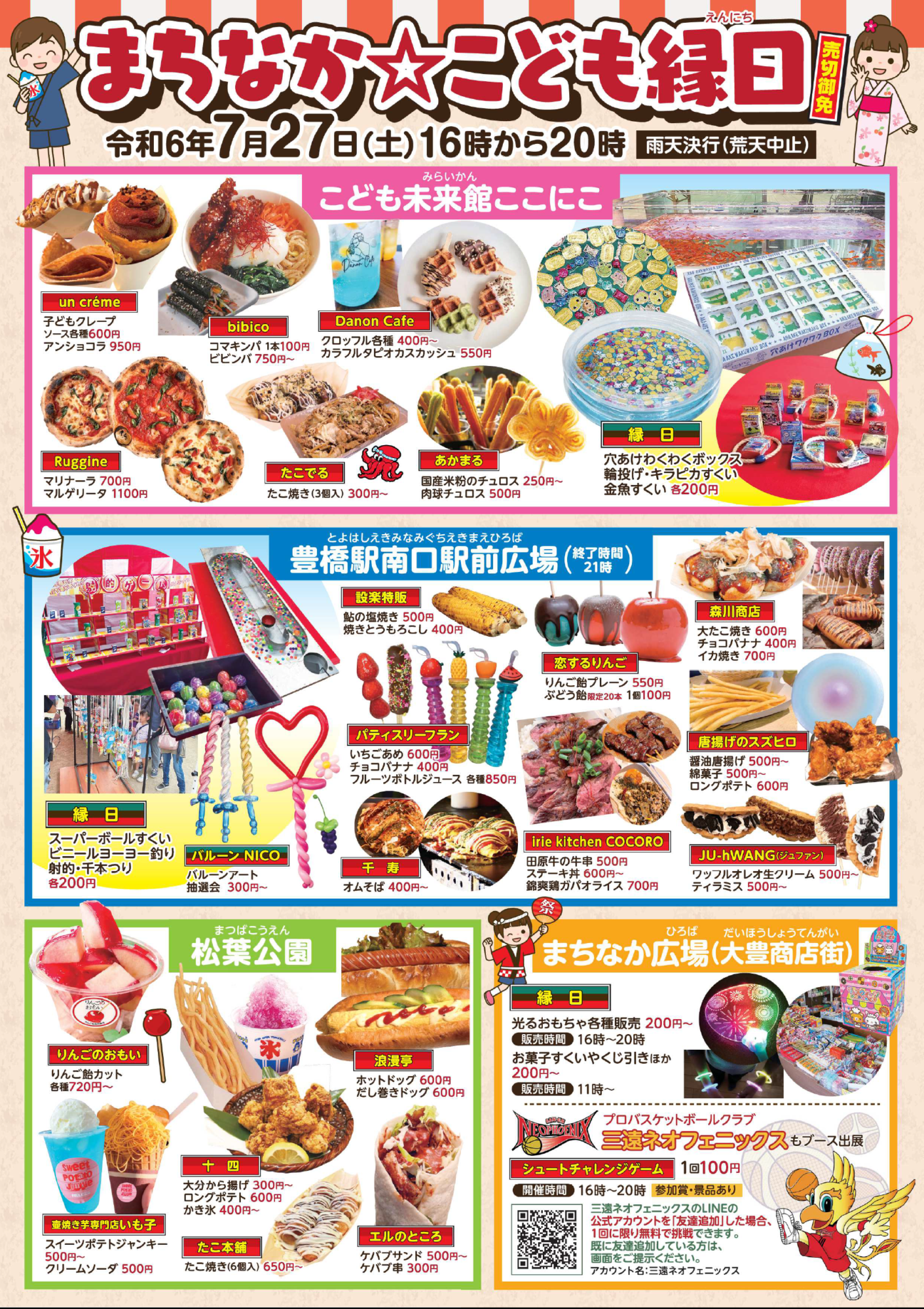 まちなか☆こども縁日を7月27日に開催します!こども未来館ここにこ、豊橋駅南口駅前広場、松葉公園、まちなか広場(大豊商店街)の各会場を巡ってこども縁日を楽しもう!