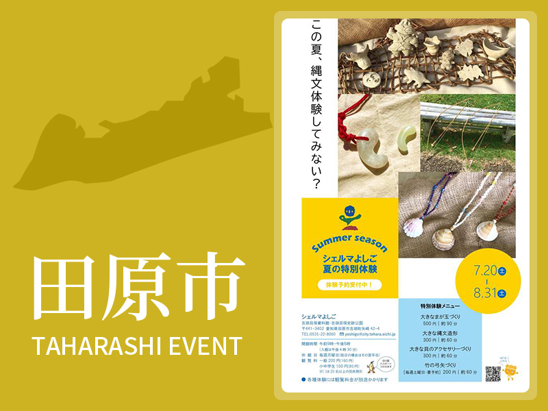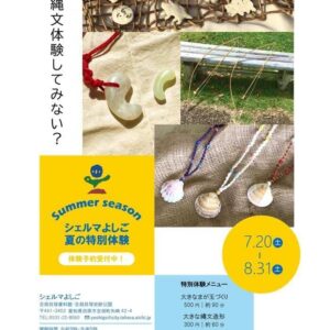 シェルマよしごで、夏の特別体験を実施します。大きなまが玉づくり、大きな縄文造形、大きな貝のアクセサリーづくり、竹の弓矢づくり(要予約)を体験できます。