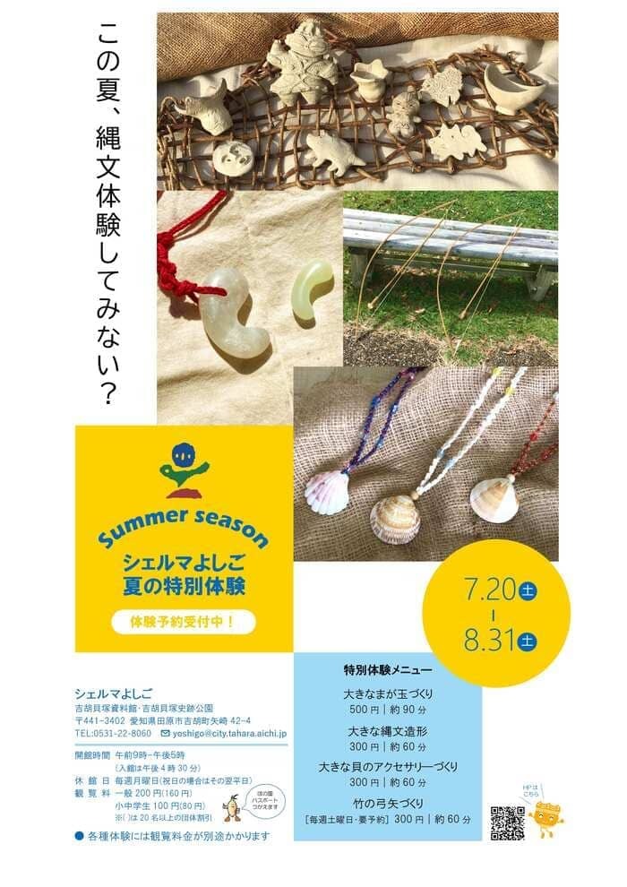 シェルマよしごで、夏の特別体験を実施します。大きなまが玉づくり、大きな縄文造形、大きな貝のアクセサリーづくり、竹の弓矢づくり(要予約)を体験できます。