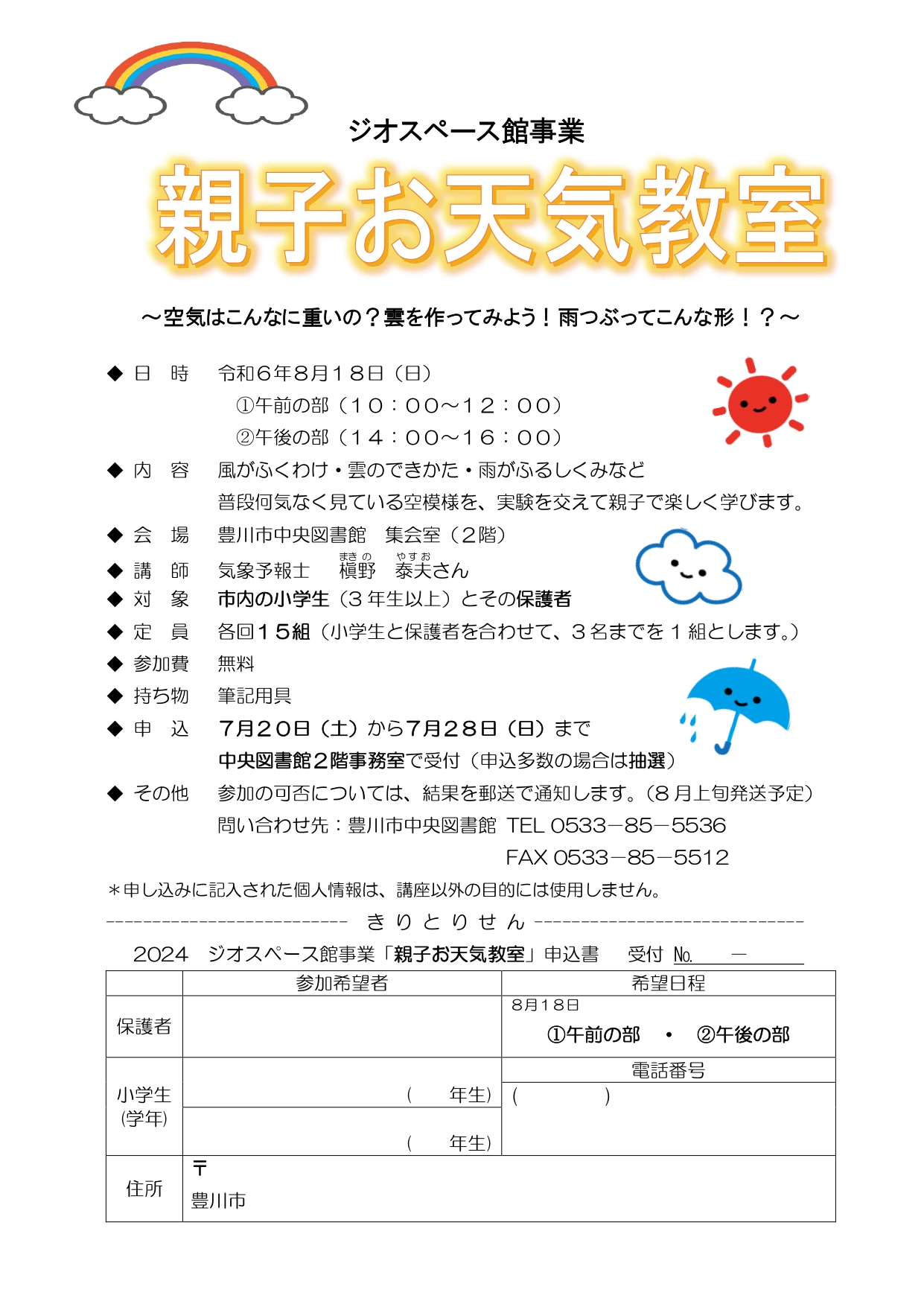 | 定員 | 各回15組(小学生と保護者を合わせて、3名までを1組とします。) |