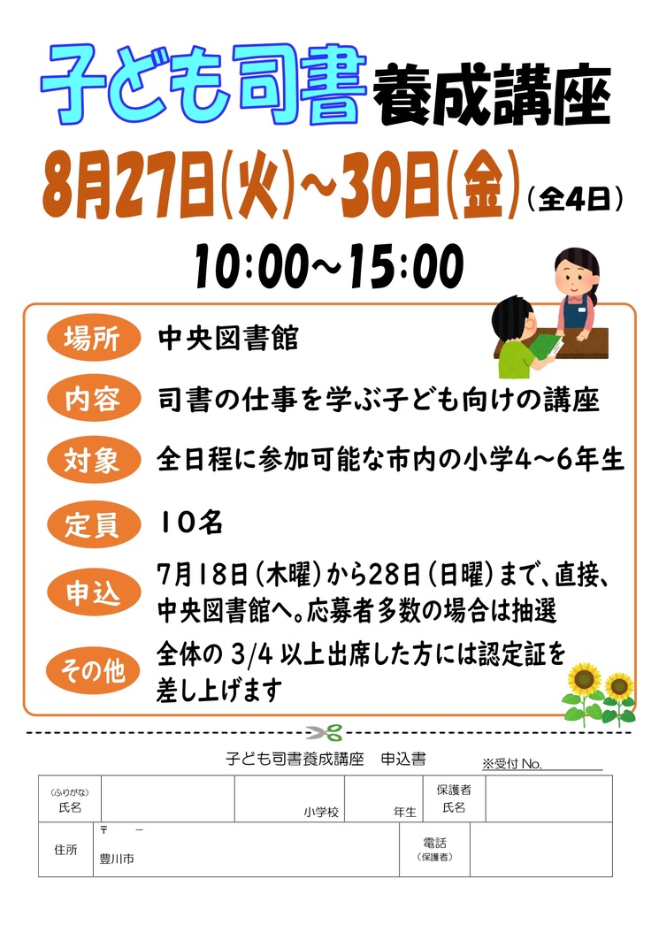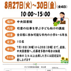 中央図書館では、今年度から「子ども司書養成講座」を8月27日(火)から30日(金)まで開催します。