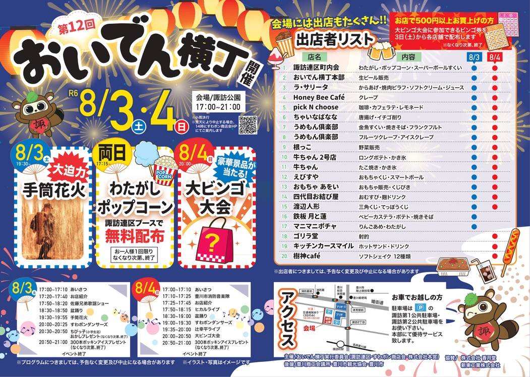 おいでん横丁実行委員会(すわポン商店会・諏訪連区・株式会社本宮)が主催する、中心市街地諏訪地区の夏の夜の風物詩「第12回おいでん横丁」を諏訪公園にて開催します。