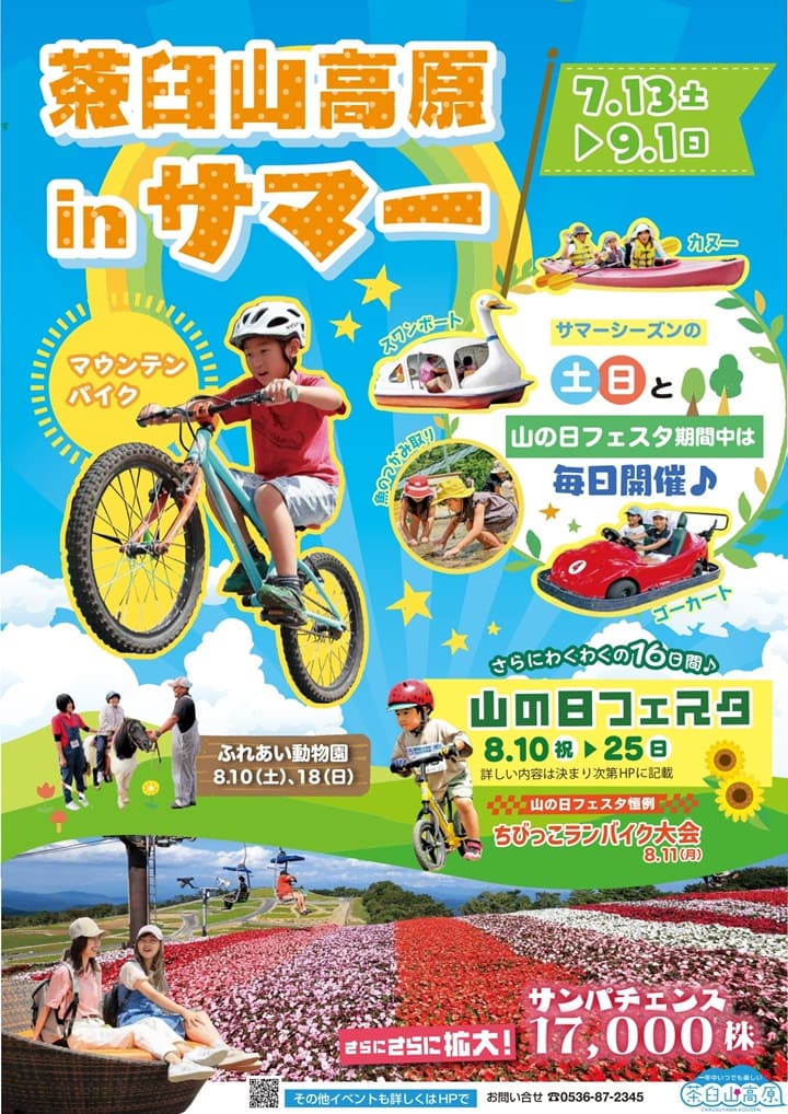 開催は土日祝のほか8月10日~8月25日の期間は「山の日フェスタ」として茶臼山高原を楽しめるイベントが開催されます。