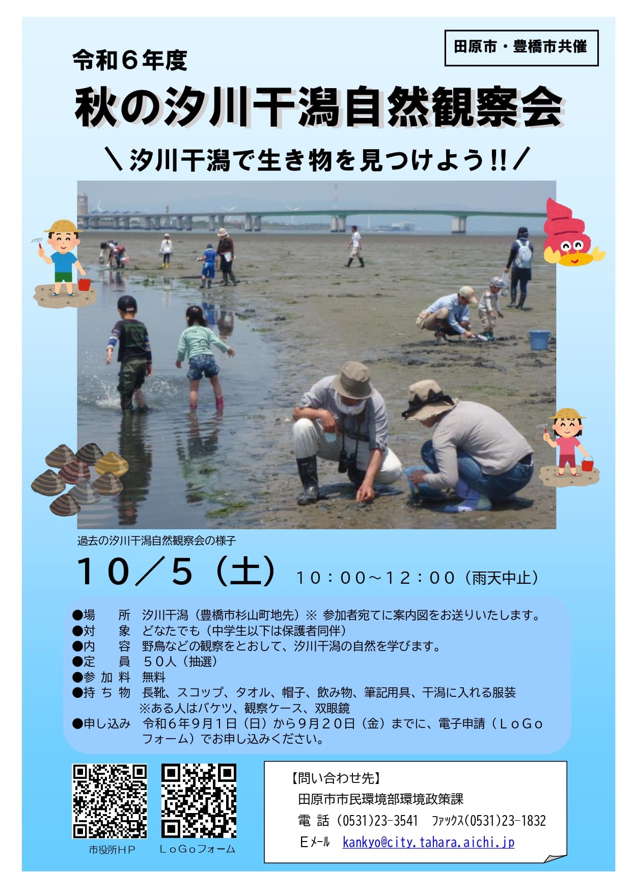 豊橋市と田原市共同で、野鳥の観察や干潟の生き物の観察会を開催します。