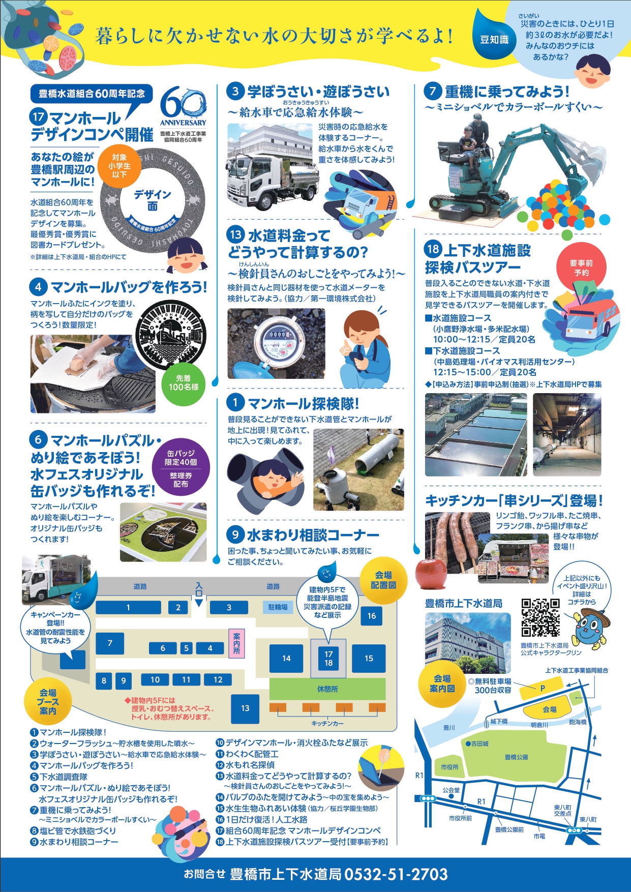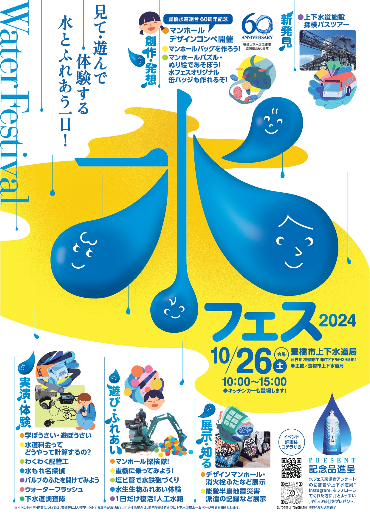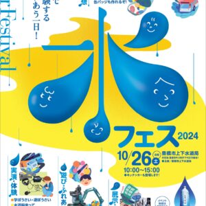 水を使った体験型コンテンツや展示など通して、「あって当たり前」と思われがちな水道・下水道について、その役割や大切さを知ってもらい、上下水道事業の理解促進を図るため、市民参加型イベント『水フェス2024』を開催します。
