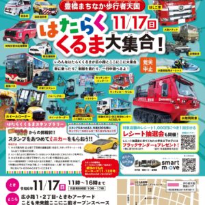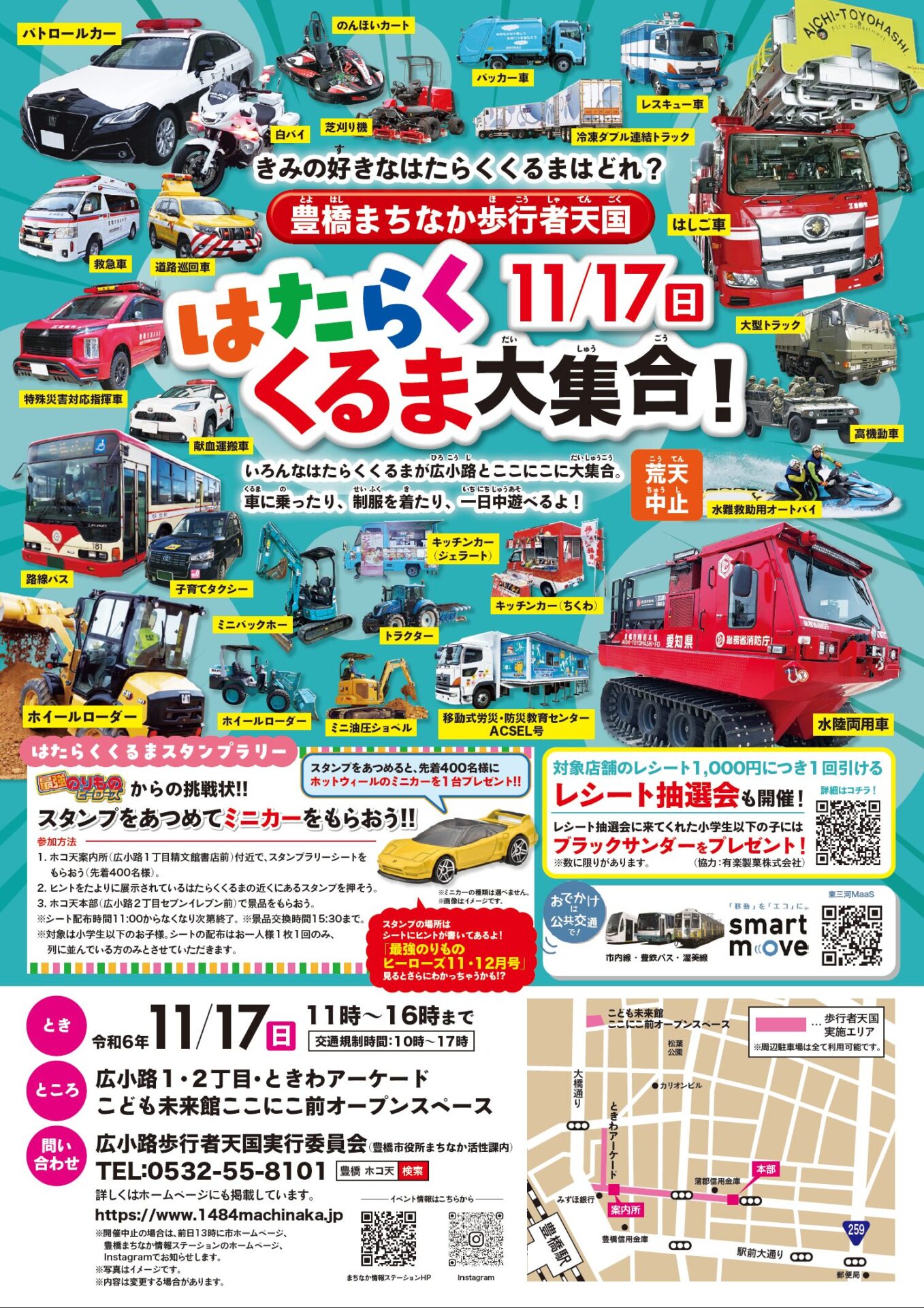 広小路通りやこども未来館ココニコに様々な「はたらくくるま」が集まる豊橋まちなか歩行者天国「はたらくくるま大集合!」を令和6年11月17日(日)に開催します(主催:広小路歩行者天国実行委員会)。