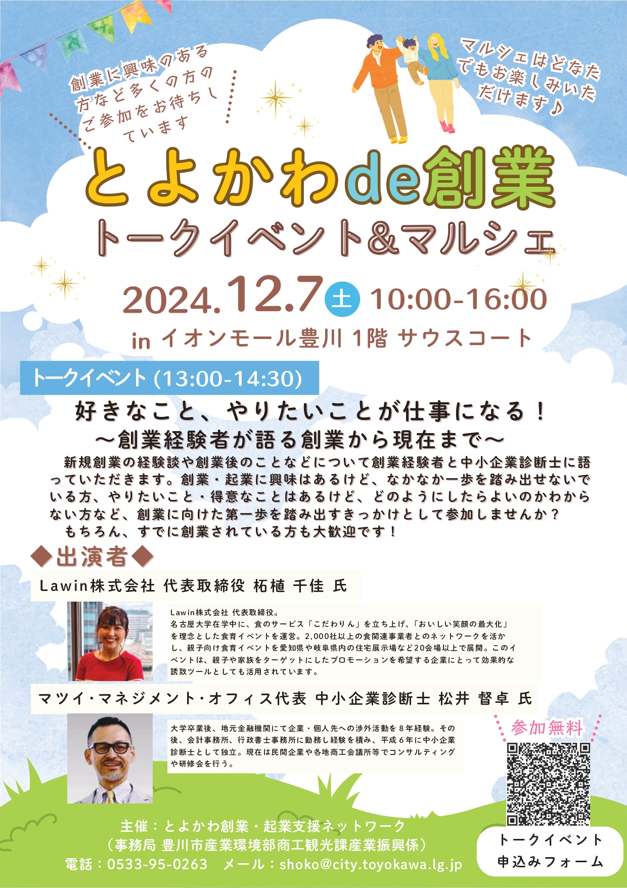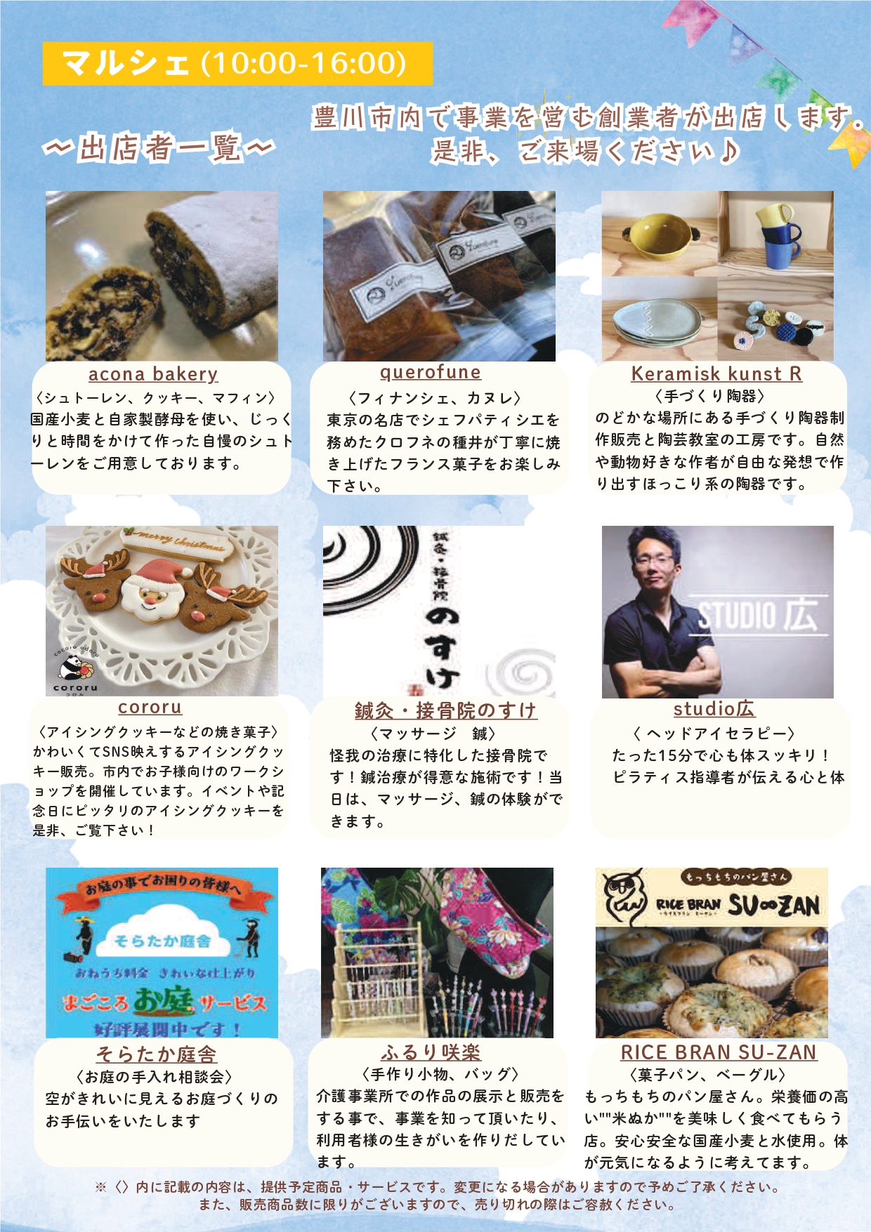 また、同会場にて、とよかわ創業・起業支援ネットワークの支援を受けて豊川市内で創業された事業者によるマルシェを開催します。是非ご来場ください。