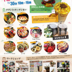 キッチンカー、テナントやテントにて花や雑貨の販売、ワークショップ、フローティングフラワーやフォトスポットの設置、クイズラリー、染め菊&アレンジ教室(要事前申込)など。