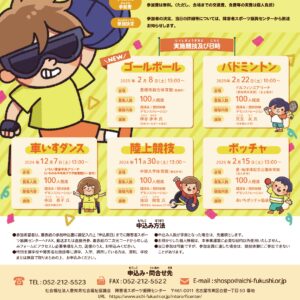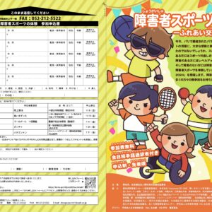 | お問い合わせ | 社会福祉法人愛知県社会福祉協議会 障害者スポーツ振興センター TEL:052-212-5523 |