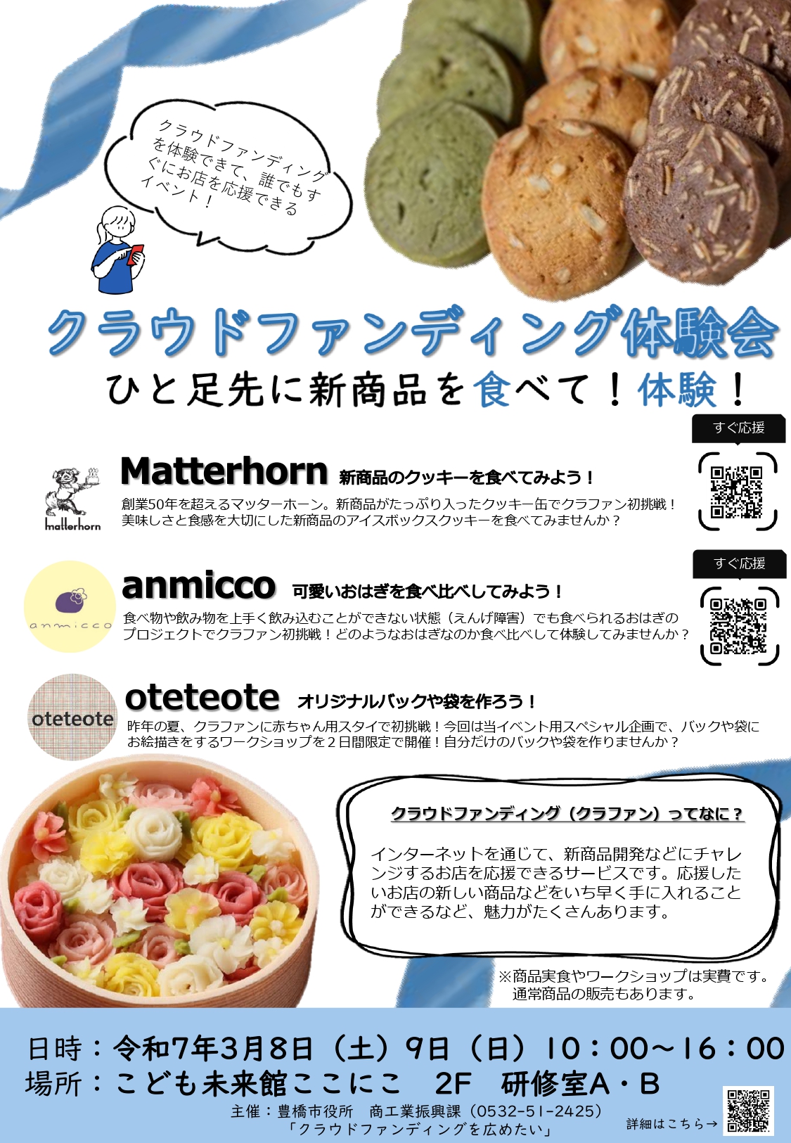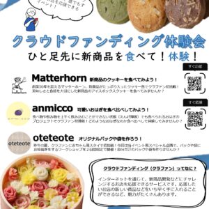 クラウドファンディングの応援購入方法が分かるほか、実際にプロジェクト挑戦中の市内の事業者が出店し、プロジェクト初挑戦中の商品をいち早く体験することができるイベントです。