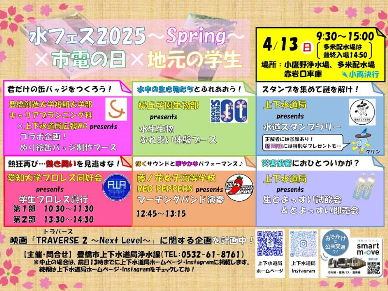 第一部では桜の咲く季節に水道施設の一般公開、第二部では豊橋鉄道株式会社・赤岩口車庫にて開催される「市電の日」イベントに合わせて、地元の高校生・大学生による多数の催し物を実施します!