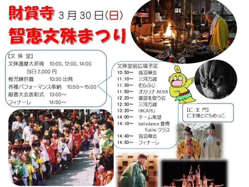 文殊護摩大祈祷、稚児練供養、書道パフォーマンス、各種奉納、大筆書き大会、仁王さま展望台、第64回智恵文殊菩薩献書大会表彰式及び作品展示など各種催し物があります。