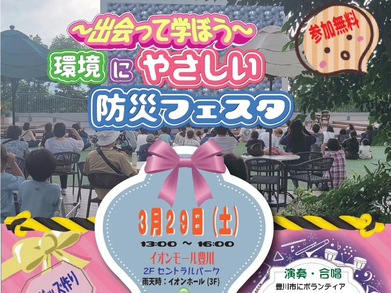 豊川市では、イオンモール豊川で、「~出会って学ぼう~環境にやさしい防災フェスタ」を開催します。これは、防災や環境にまつわるブースを通して市内で活躍している市民活動団体と楽しくふれ合うことができるイベントです。