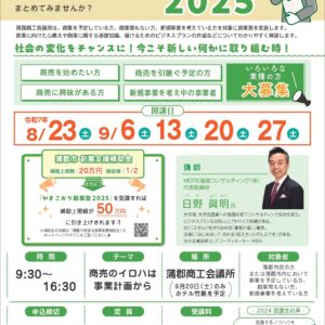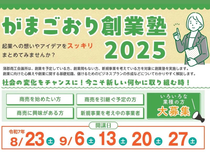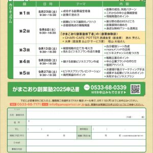 蒲郡商工会議所にて、「創業されて間もない方」「新規事業を考えている方」などを対象に、がまごおり創業塾2025が開催されます。創業に向けた心構えや創業に関する基礎知識、ビジネスプランの作成などについて、分かりやすい解説をお聞きいただけます。