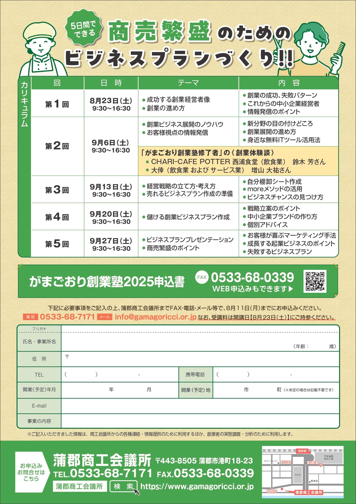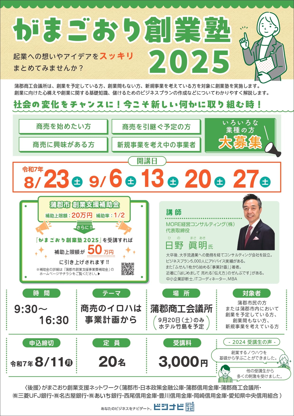 蒲郡商工会議所にて、「創業されて間もない方」「新規事業を考えている方」などを対象に、がまごおり創業塾2025が開催されます。創業に向けた心構えや創業に関する基礎知識、ビジネスプランの作成などについて、分かりやすい解説をお聞きいただけます。