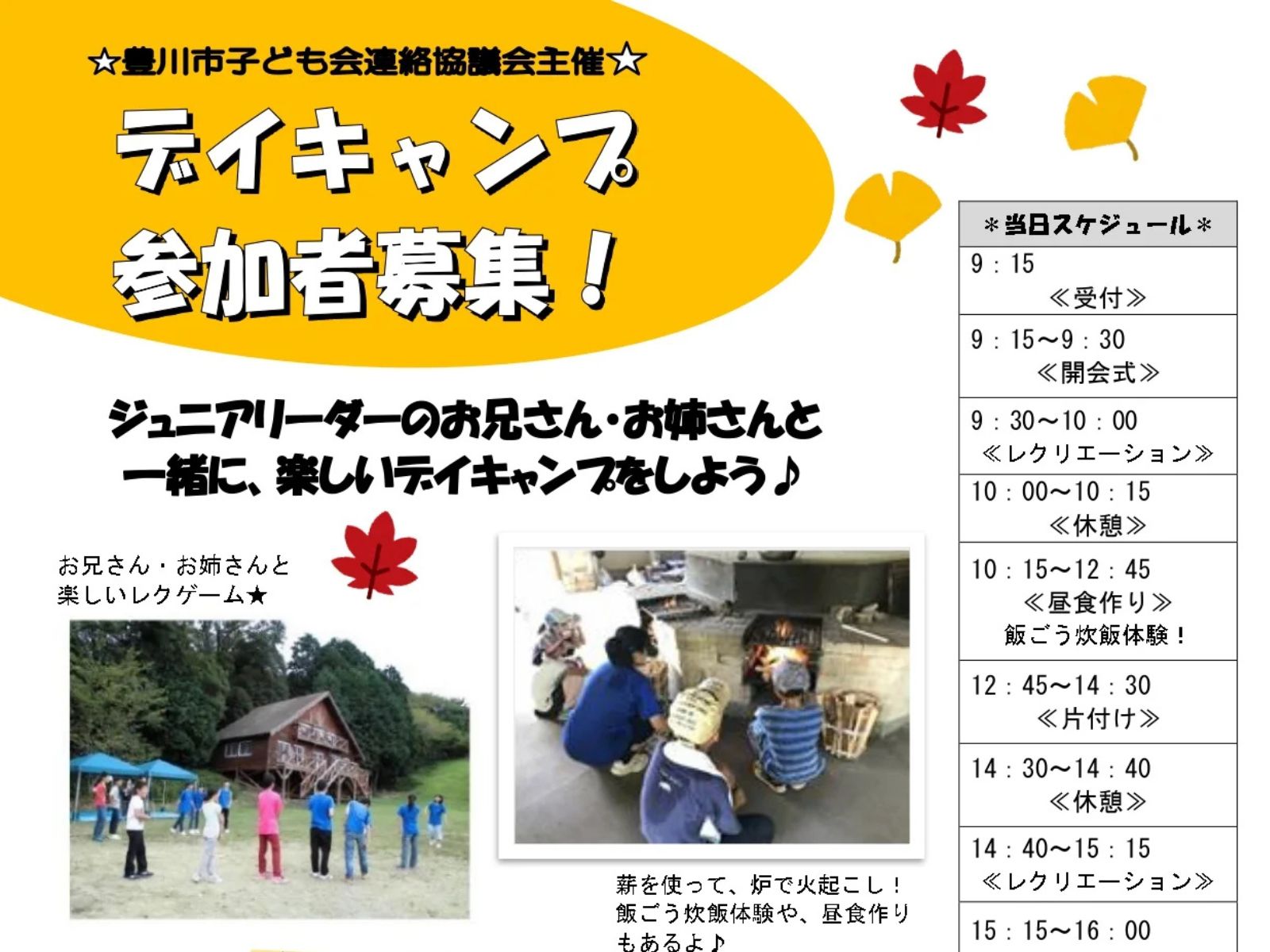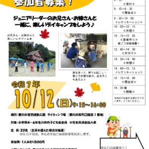 豊川市子ども会連絡協議会<ジュニアリーダーズクラブ>では、豊川市内の小学4年生から6年生の子ども会員を対象に、『デイキャンプ』を開催します!当日は、中・高校生のジュニアリーダーのお兄さん・お姉さんと一緒に、楽しい「レクリエーションゲーム」や「飯ごう炊飯体験」、「野外での昼食づくり」を予定しています。ぜひ、みなさんの参加をお待ちしています。((注意)事前申込制です)