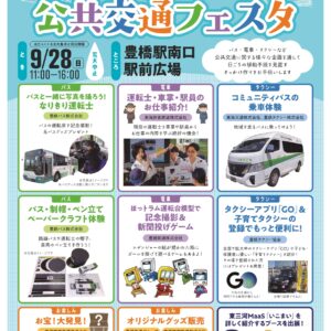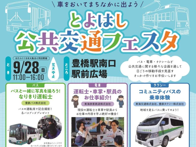 バス・鉄道・タクシーなど公共交通に関する様々な企画を通して、日ごろの移動手段を見直すきっかけ作りをお手伝いするため、「とよはし公共交通フェスタ」を開催します!同日にまちなかでは「豊橋まちなか歩行者天国」、「おさんぽマルシェ」を開催していますので、各会場を巡りながらお楽しみください!