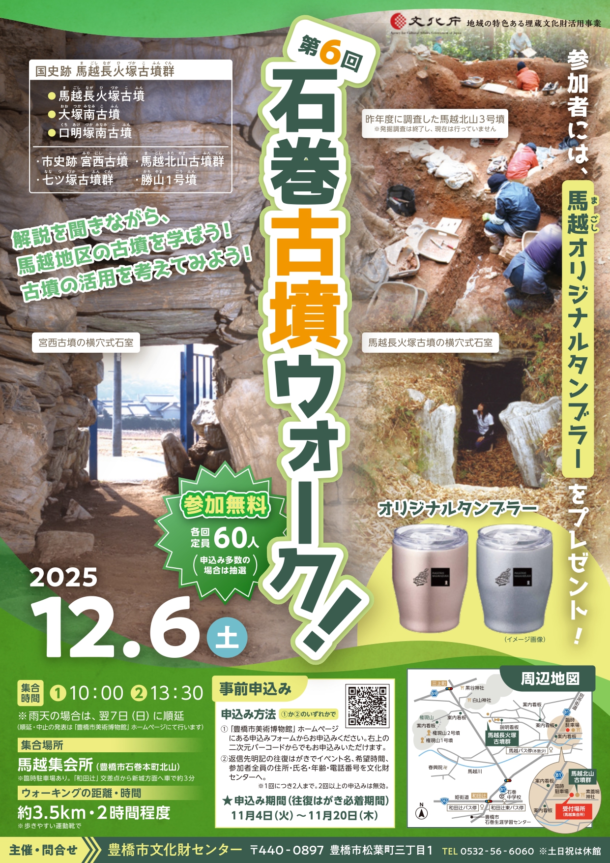 ②返信先明記の往復はがきでイベント名、希望時間、参加者全員の住所・氏名・年齢・電話番号を豊橋市文化財センター(〒440-0897 豊橋市松葉町三丁目1番地)へ