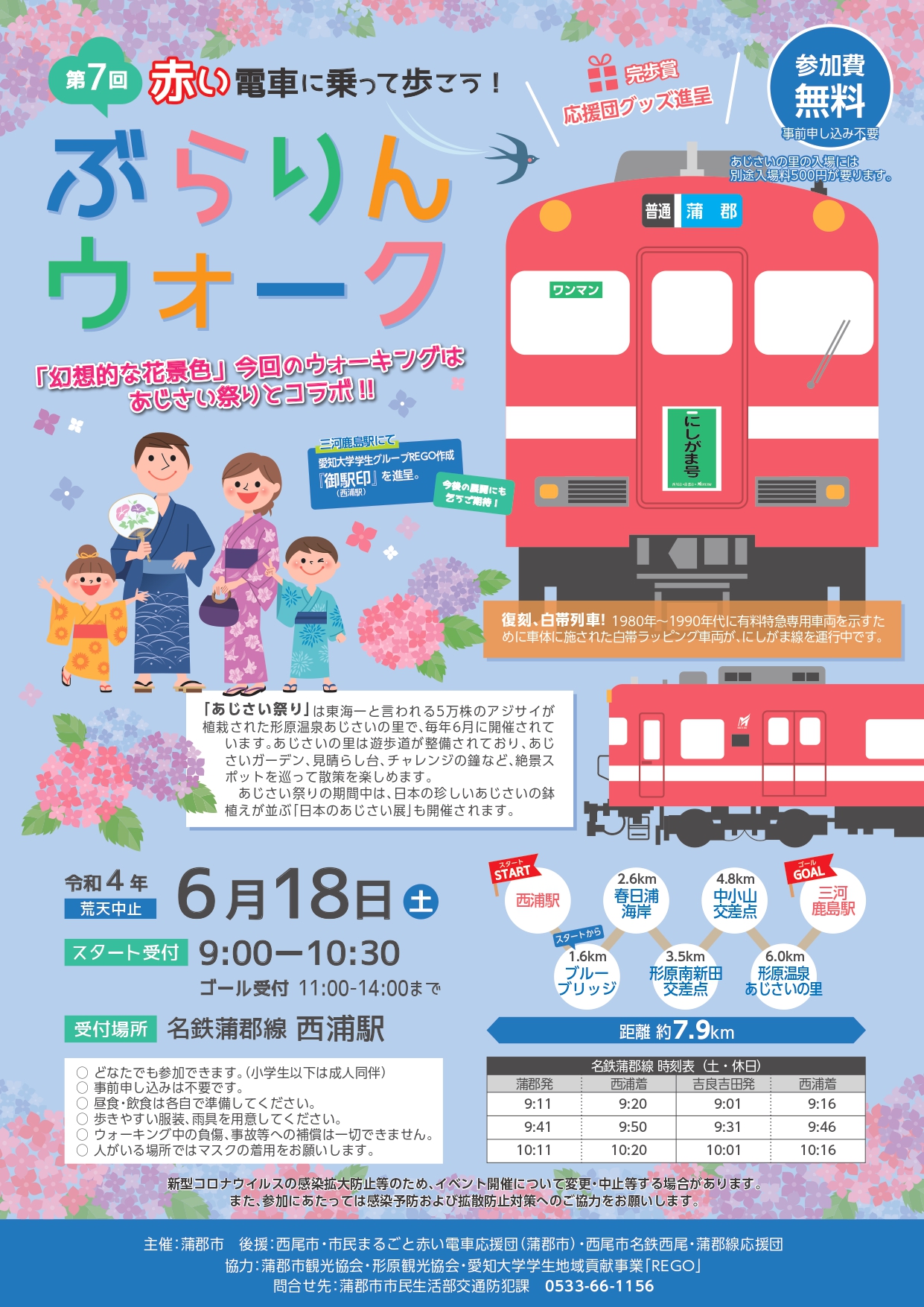 名鉄西尾・蒲郡線の利用促進を目的とした「第7回赤い電車に乗って歩こう!ぶらりんウォーク」を6月18日(土曜日)に開催いたします。