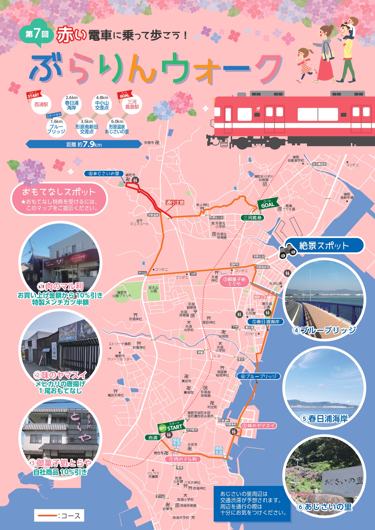 今回は形原温泉あじさいの里「あじさい祭り」を散策するコースとなっています。名鉄蒲郡線西浦駅をスタートし、ブルーブリッジを渡り、春日浦海岸を歩きます。その後、あじさいが見頃の形原温泉あじさいの里を通り、ゴールの三河鹿島駅を目指す約7.9kmのコースです。