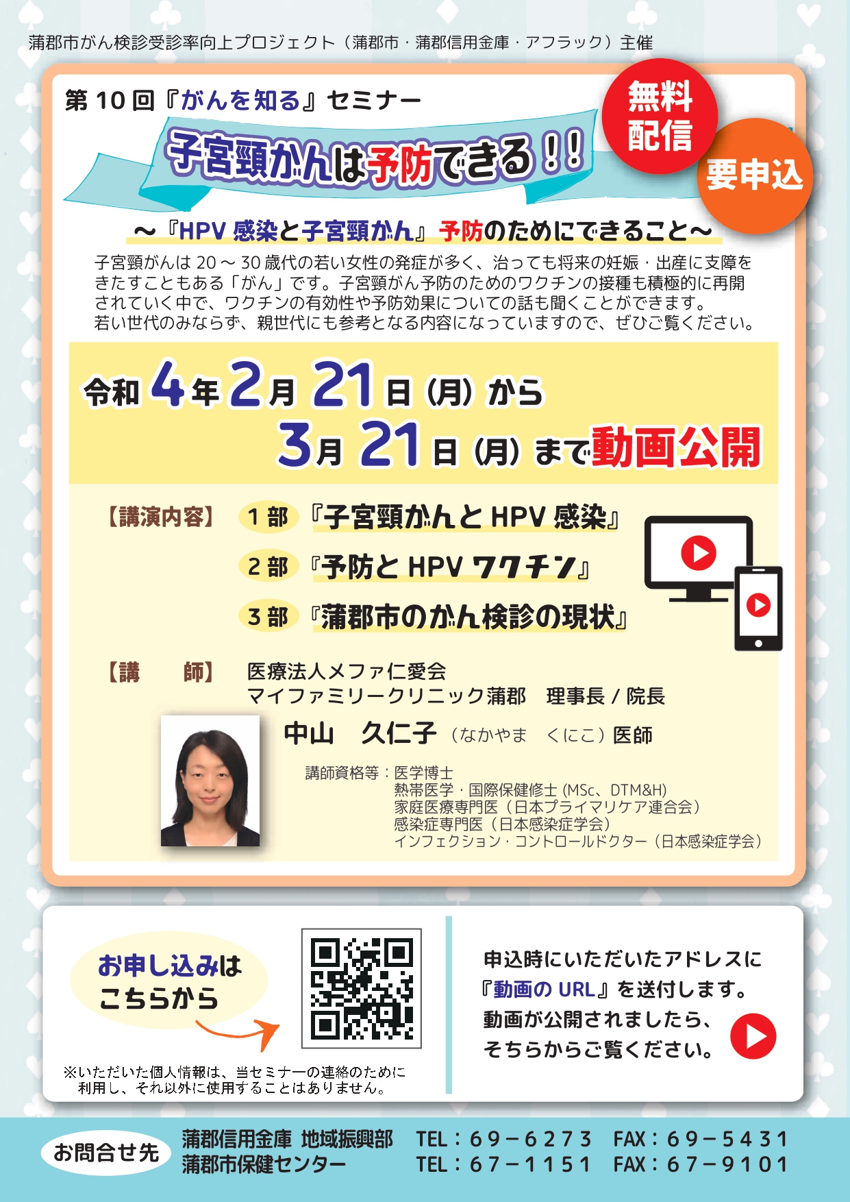 子宮頸がんについては、予防のためのワクチン接種も積極的に再開予定となっており、ワクチンの有効性や安全性等気になっている方にも参考になる講演内容となっています。