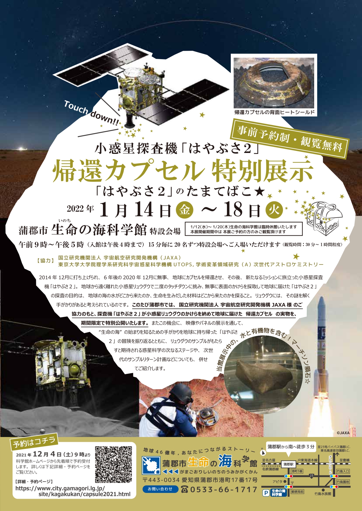 このたび蒲郡市では、国立研究機関法人 宇宙航空研究開発機構 JAXA様 のご協力のもと、探査機「はやぶさ2」が小惑星リュウグウのかけらを納めて地球に届けた 帰還カプセル の実物を、期間限定で特別公開いたします。