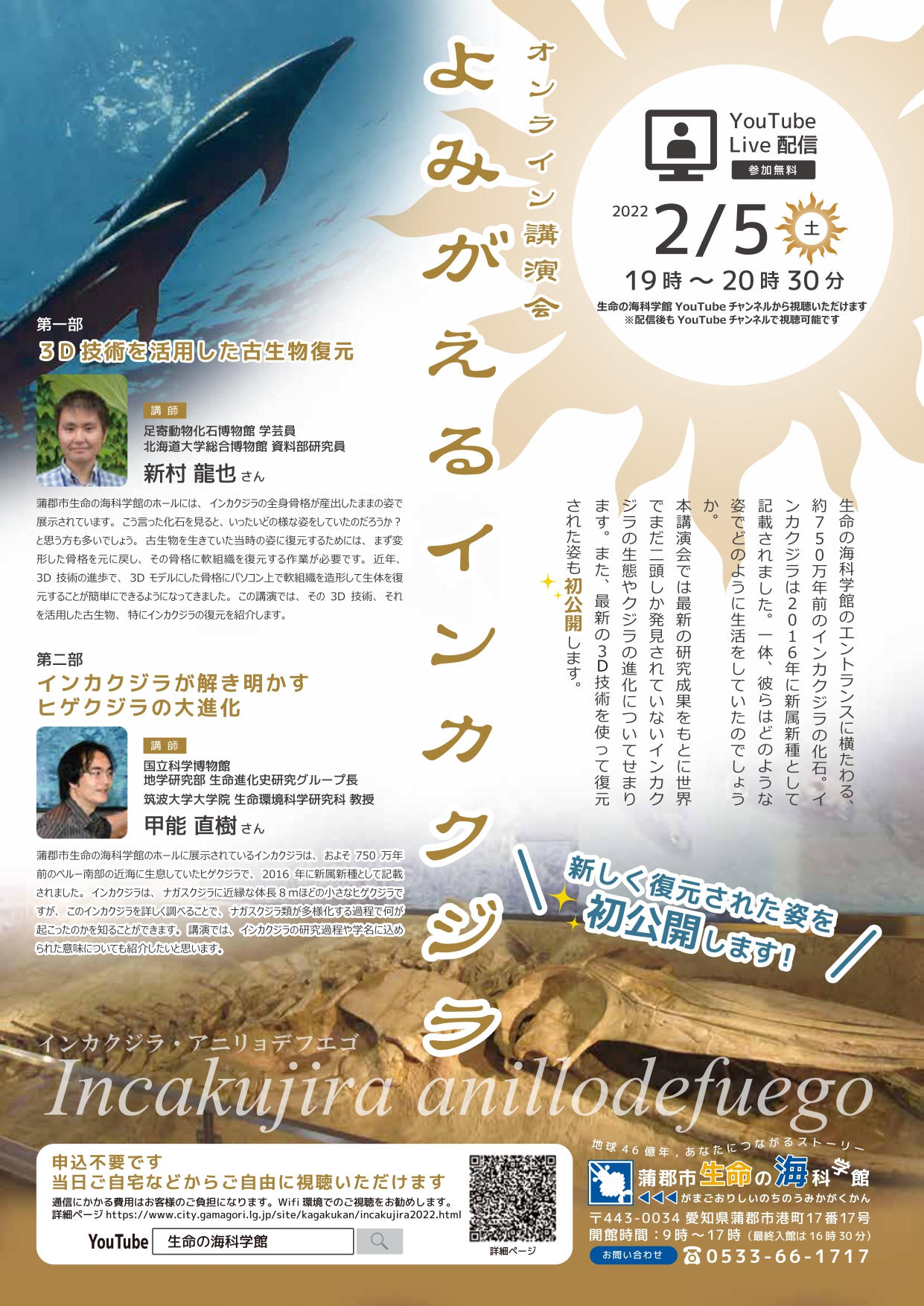蒲郡市生命の海科学館のホールに展示されているインカクジラは、およそ750万年前のペルー南部の近海に生息していたヒゲクジラで、2016年に新属新種として記載されました。インカクジラは、ナガスクジラに近縁な体長8mほどの小さなヒゲクジラですが、このインカクジラを詳しく調べることで、ナガスクジラ類が多様化する過程で何が起こったのかを知ることができます。講演では、インカクジラの研究過程や学名に込められた意味についても紹介したいと思います。
