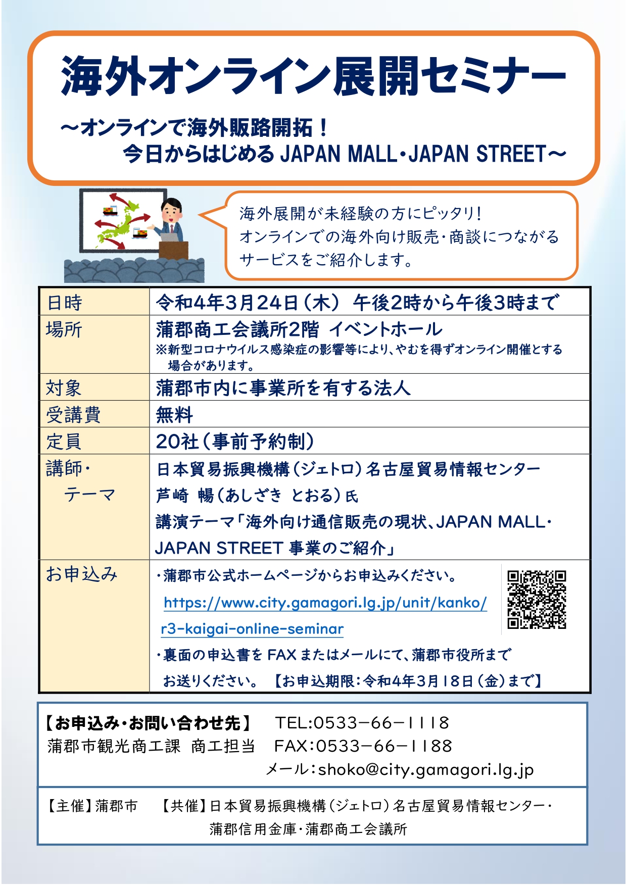 市内企業の皆さま向けに、海外向けにオンラインで販売・商談が行えるサービスをご紹介する「海外オンライン展開セミナー」を開催いたします。