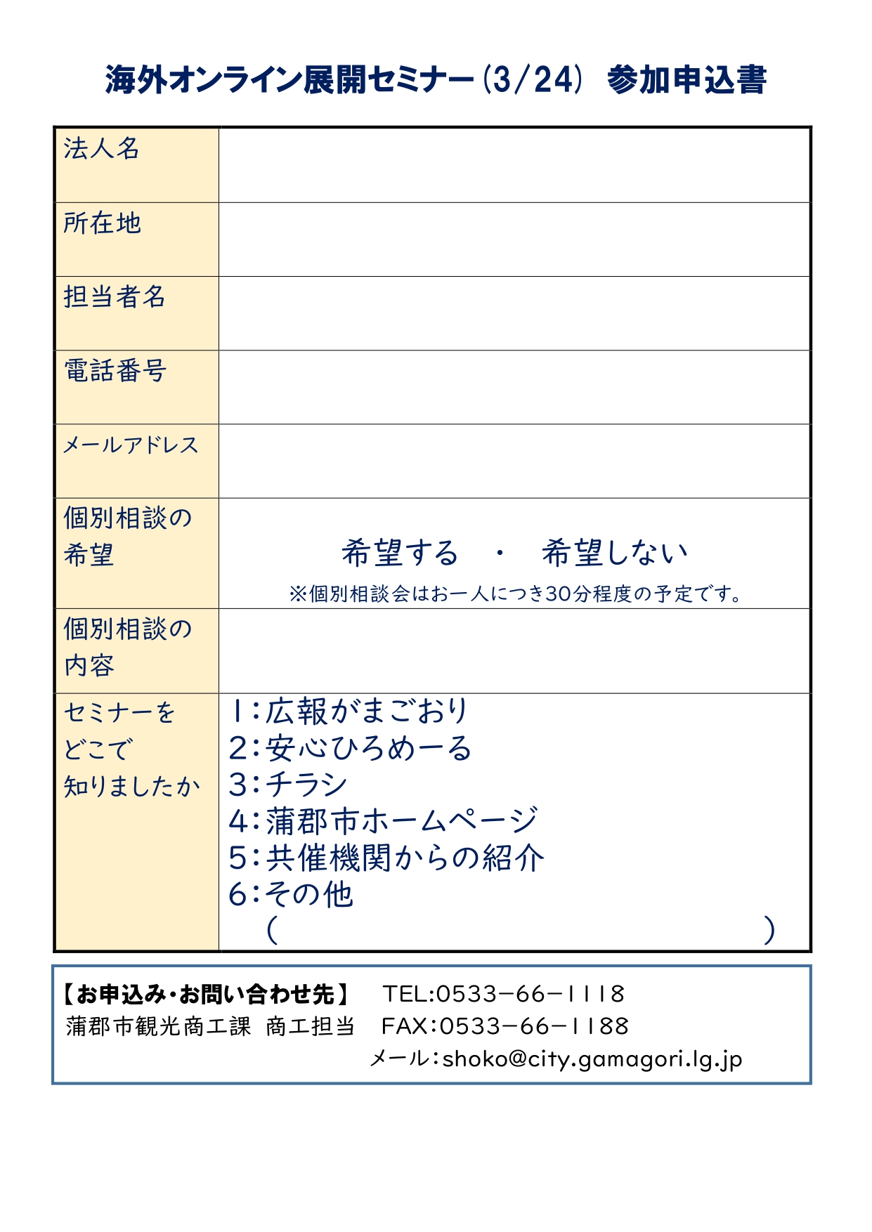 海外オンライン展開セミナー 申込書 [Wordファイル/21KB] /[PDFファイル/140KB]