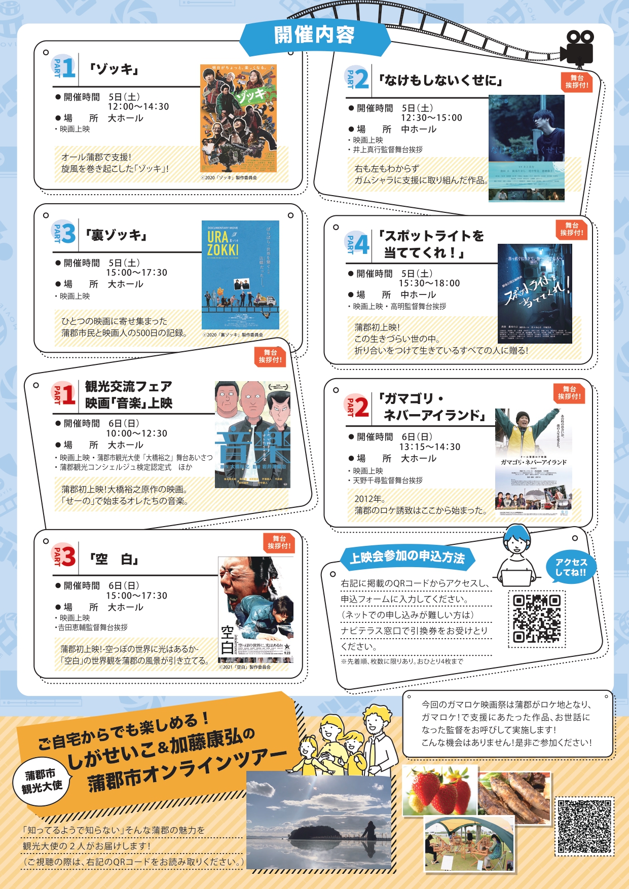 蒲郡の観光の最新情報を知ることができる「がまごおり観光交流フェア」。今回は「ガマロケ映画祭」と同時開催し、映画「ゾッキ」、「空白」等蒲郡市内でロケが行われた映画、蒲郡にゆかりのある映画が2日間でなんと7本も上映されます!