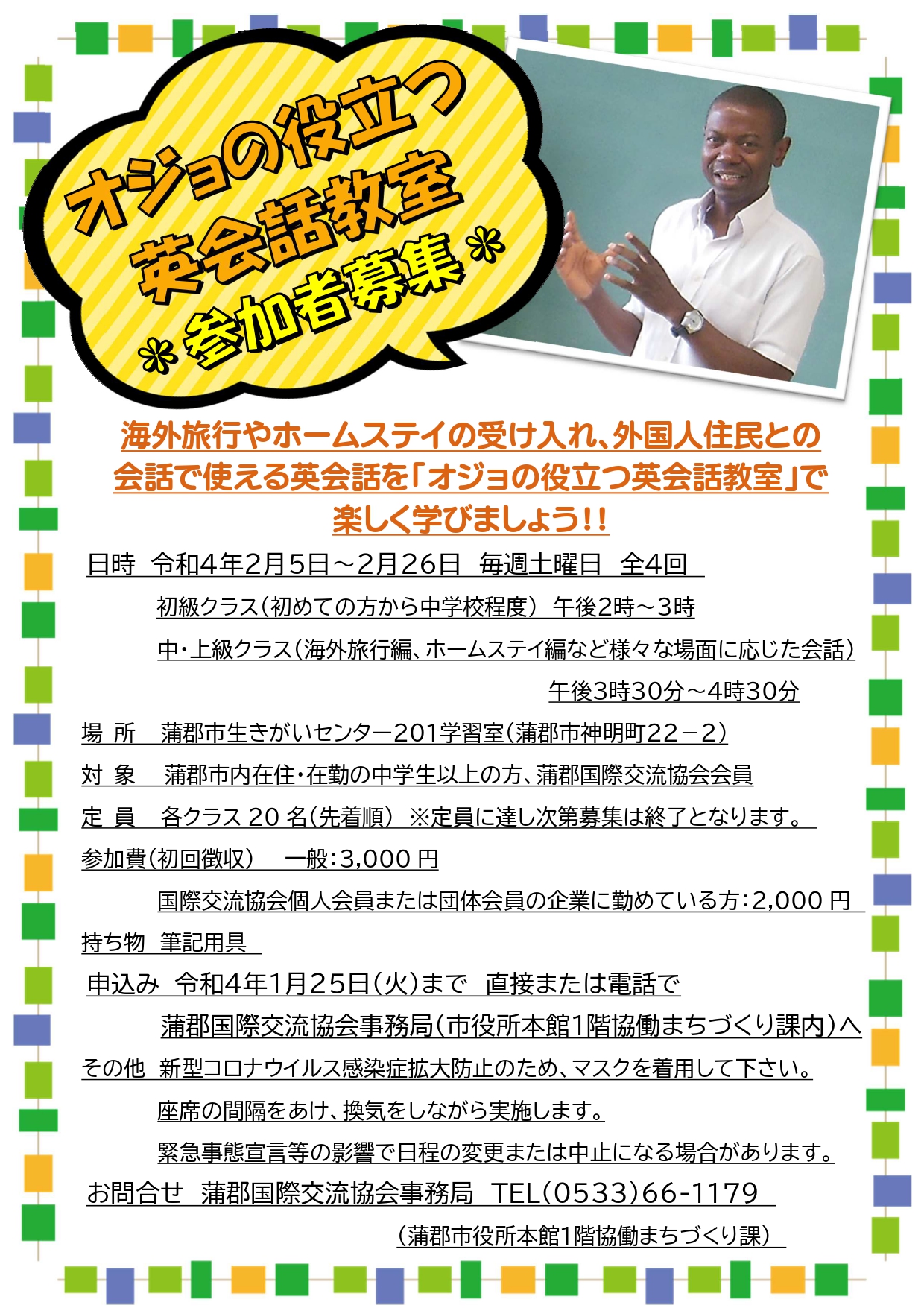 | 申込方法 | 2022年1月25日(火)まで 直接または電話で、蒲郡国際交流協会事務局(市役所本館1階協働まちづくり課内)へお申し込みください |