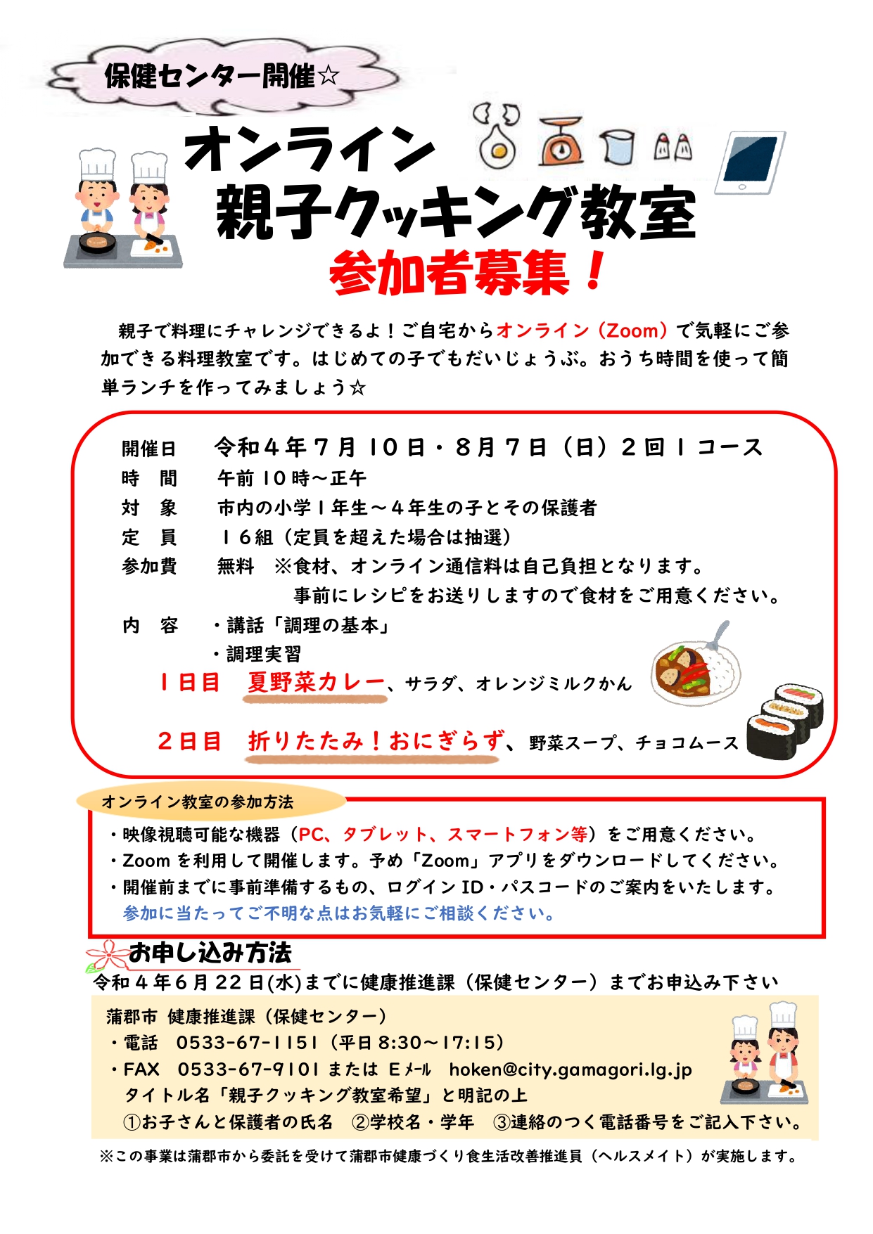 「親子クッキング教室希望」と明示の上、お子さんと保護者の氏名、学校名・学年、電話番号を記入し、電話、ファクス、メールいずれかで健康推進課へお申込みください。
