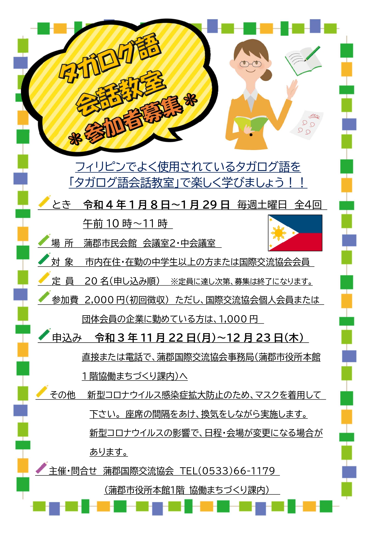 | 申込方法 | 直接または電話で、蒲郡国際交流協会事務局(蒲郡市役所本館1階 協働まちづくり課内、 TEL:0533-66-1179)までお申込みください。 |