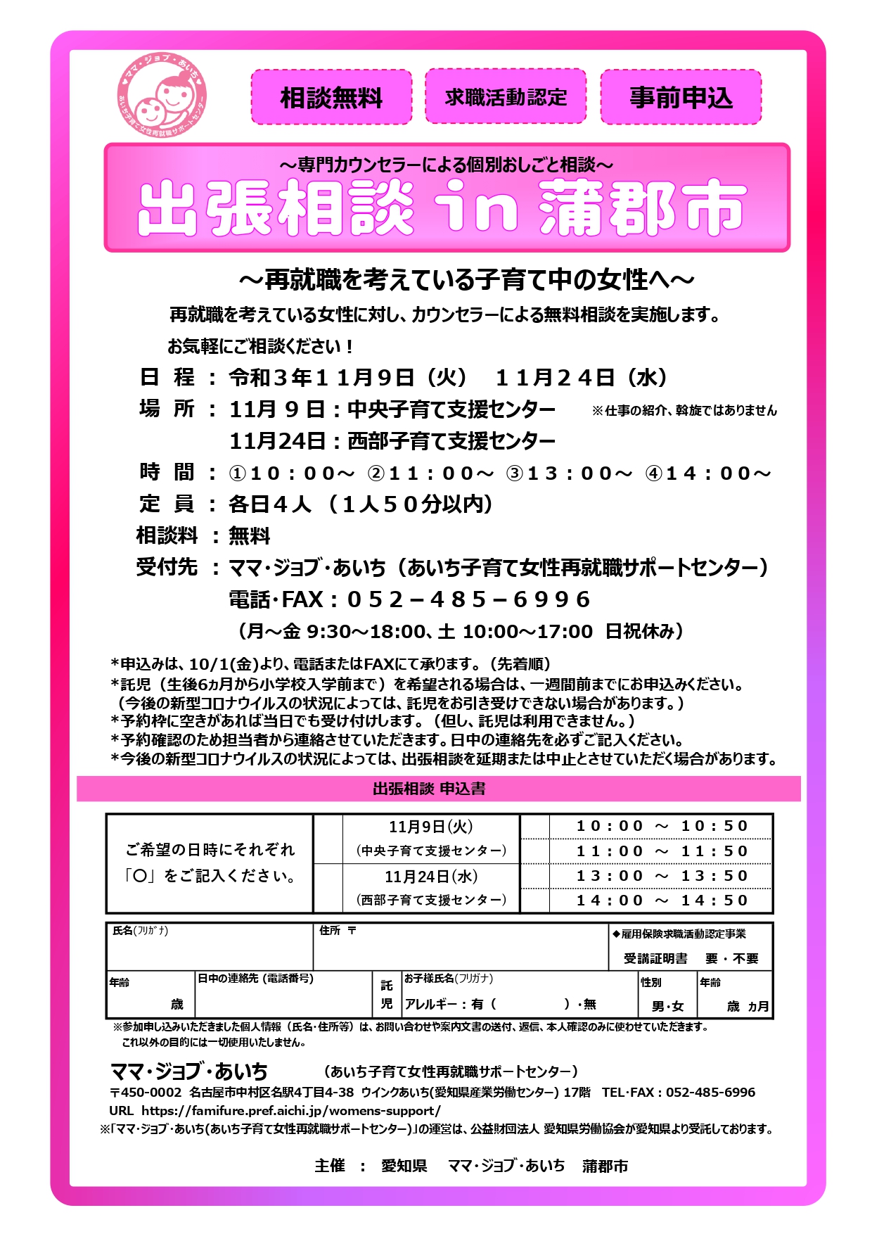 | 詳細 | 蒲郡市HP、チラシPDF、ママ・ジョブ・あいちHP ※本ページは2021.10.12時点の情報になります。 |