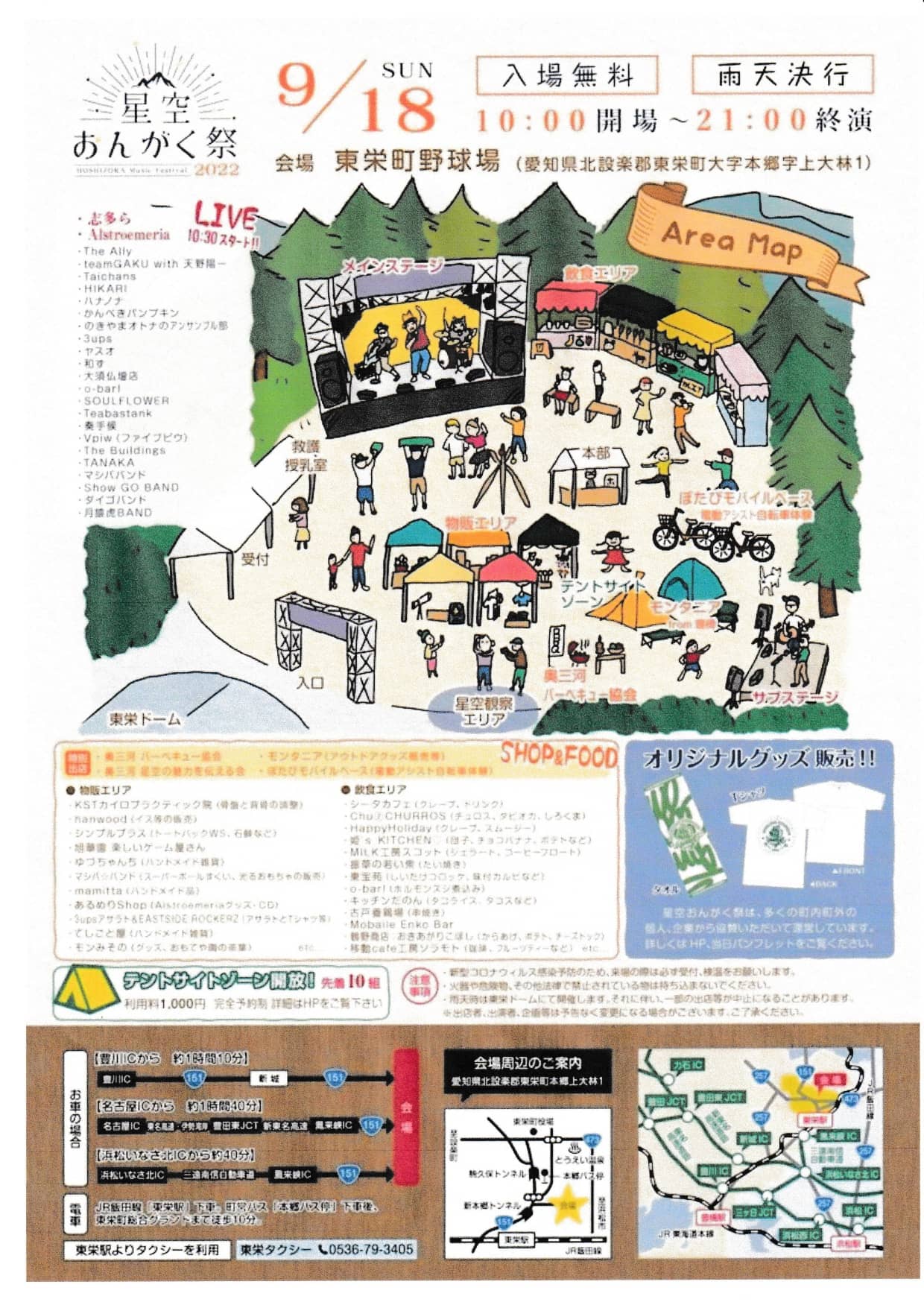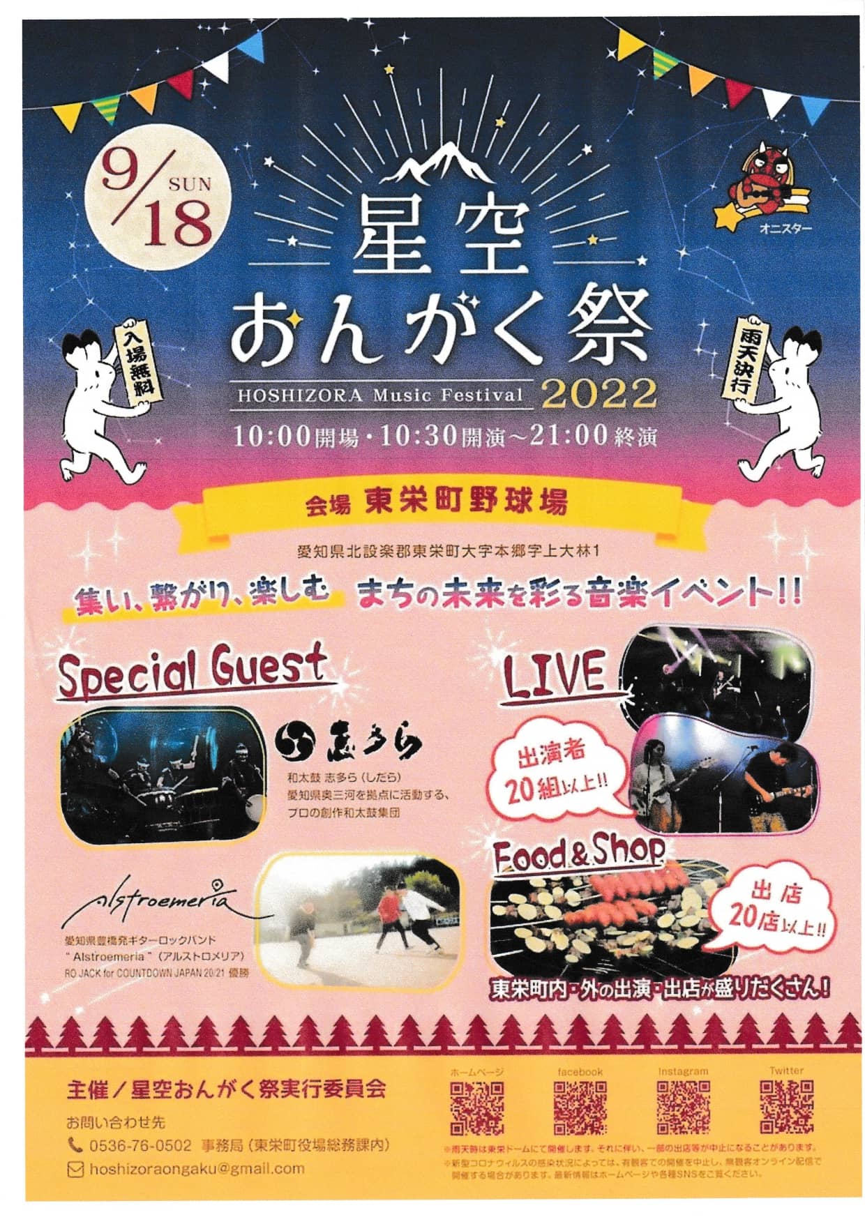 | お問い合わせ | 星空おんがく祭実行委員会 メール:hoshizoraongaku@gmail.com TEL:0536-76-0502(東栄町役場振興課) 住所:愛知県北設楽郡東栄町本郷上前畑25 |