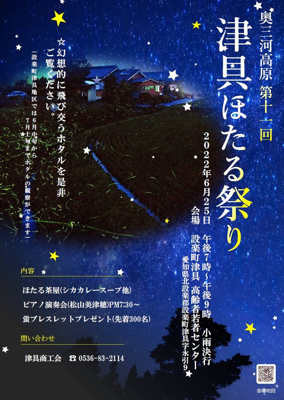 ホタルの美しい集落、津具地区にて開催されるほたる祭りです。鹿カレースープ等を提供する「ほたる茶屋」や、「ピアノ演奏会」が行われます。