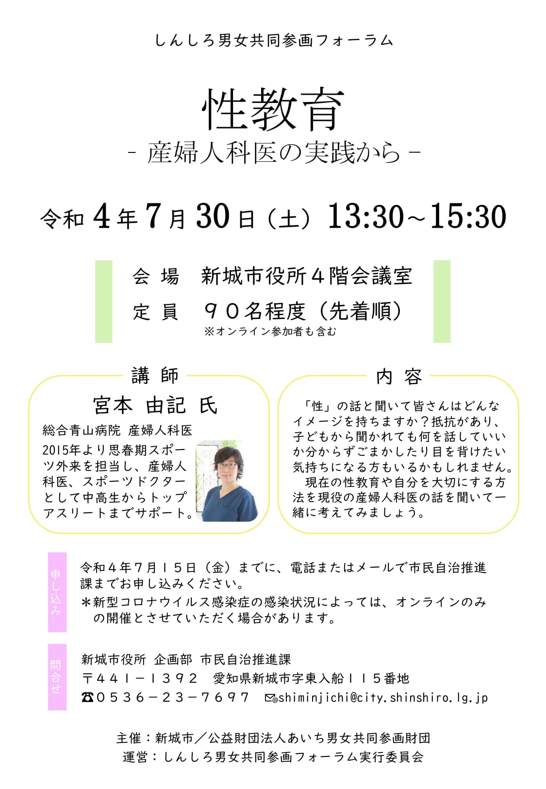 | 申込方法 | 新城市役所 市民自治推進課まで電話またはメールにて TEL:0536-23-7697 メール:shiminjichi@city.shinshiro.lg.jp ※申込期限:2022年7月15日(金) |