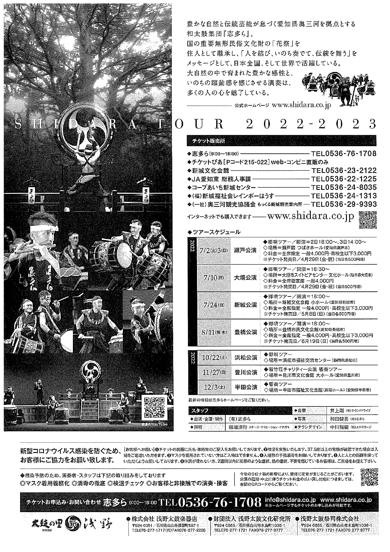 ◆志多ら(9:00〜18:00) TEL:0536-76-1708 ◆チケットぴあ[Pコード215-022] ◆新城文化会館 TEL:0536-23-2122 ◆JA愛知東 総務人事課 TEL:0536-22-1225 ◆コープあいち新城センター TEL:0536-24-8035 ◆(福)新城福祉会レインボーはうす TEL:0536-24-1313 ◆(一社)奥三河観光協議会もっくる新城観光案内所 TEL:0536-29-9393 インターネットでも購入できます→志多らHP |
