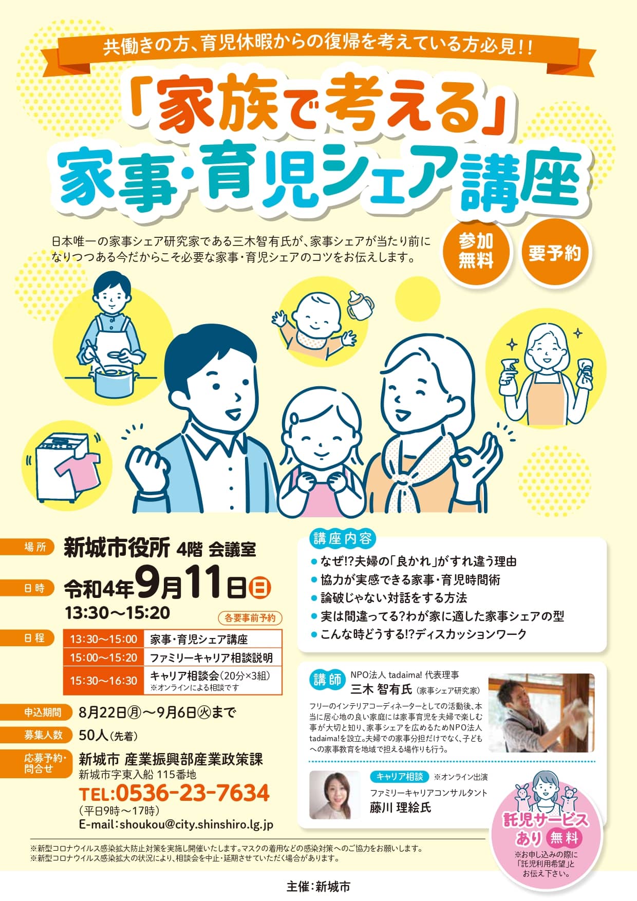 | 申込方法 | 新城市 産業振興部産業政策課(新城市字東入船115番地) TEL: 0536-23-7634 (平日9:00~17:00) E-mail: shoukou@city.shinshiro.lg.jp |