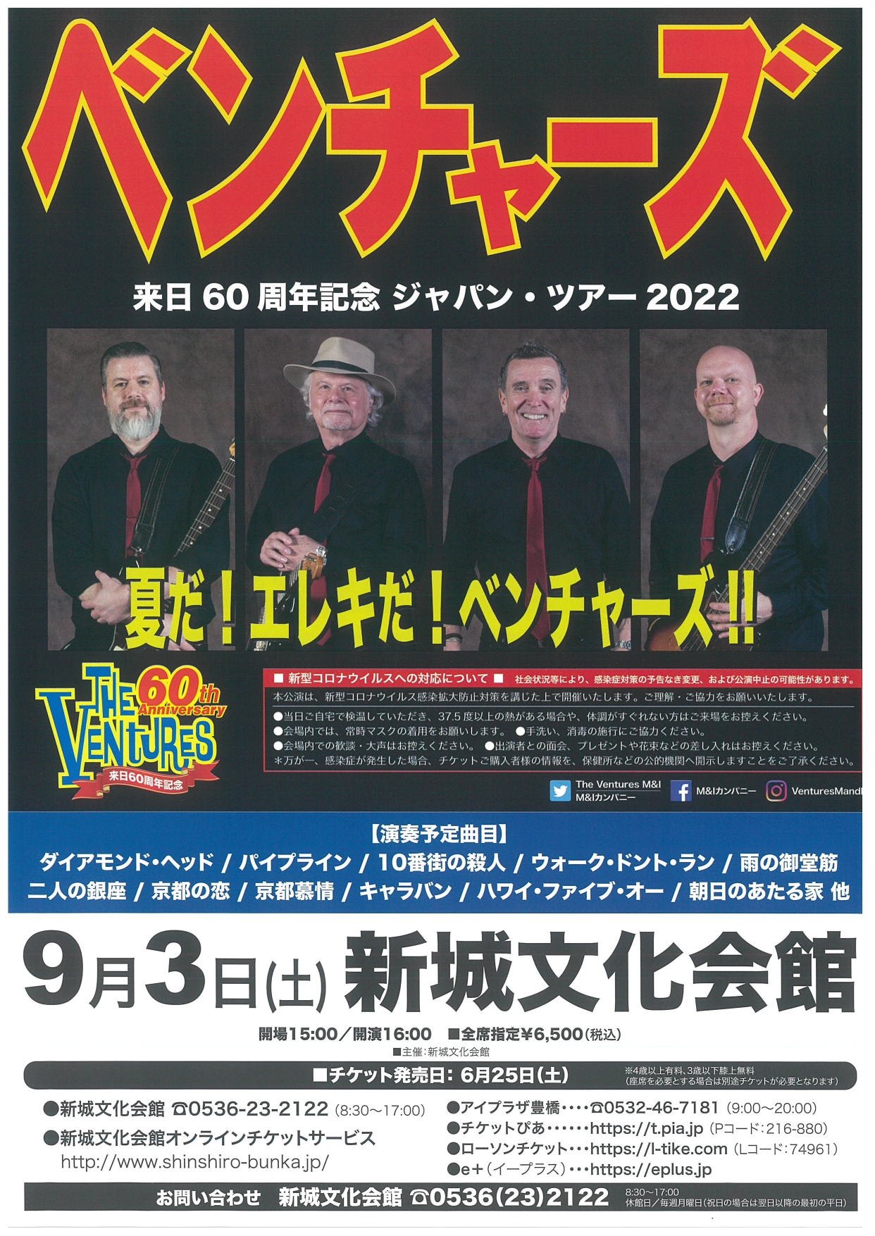 | チケット取り扱い | ●新城文化会館 TEL:0536-23-2122(8:30~17:00) ●新城文化会館オンラインチケットサービス こちらから ベンチャーズ 来日60周年記念ジャパン・ツアー – トールツリーオンラインチケットサービス ●アイプラザ豊橋 TEL:0532-46-7181(9:00~20:00) ●チケットぴあ https://t.pia.jp(Pコード:216-880) ●ローソンチケット https://l-tike.com(Lコード:74961) ●e+(イープラス) https://eplus.jp |