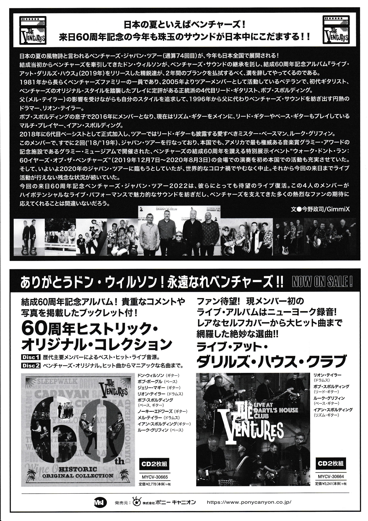 今回の来日60周年記念ベンチャーズ・ジャパン・ツアー2022は、彼らにとっても待望のライプ復活。この4人のメンバーがハイポテンシャルなライブ・パフォーマンスで魅力的なサウンドを紡ぎだし、ベンチャーズを支えてきた多くの熱烈なファンの期待に応えてくれることは間違いないだろう。
