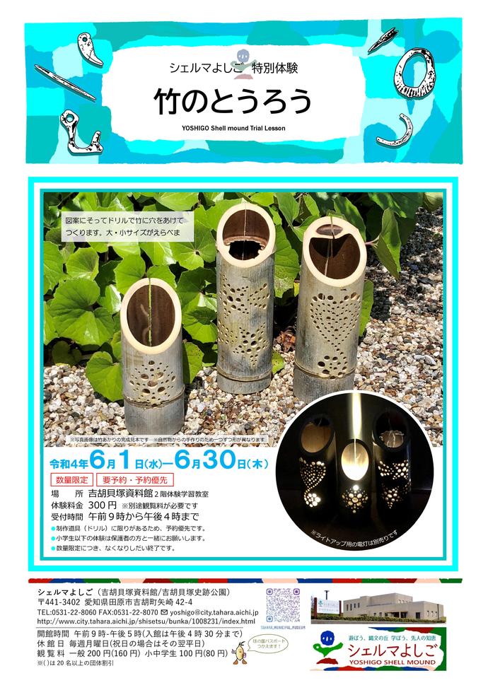 吉胡貝塚史跡公園(シェルマよしご)では、特別体験として6月1日より『竹あかりづくり』を開催します。
