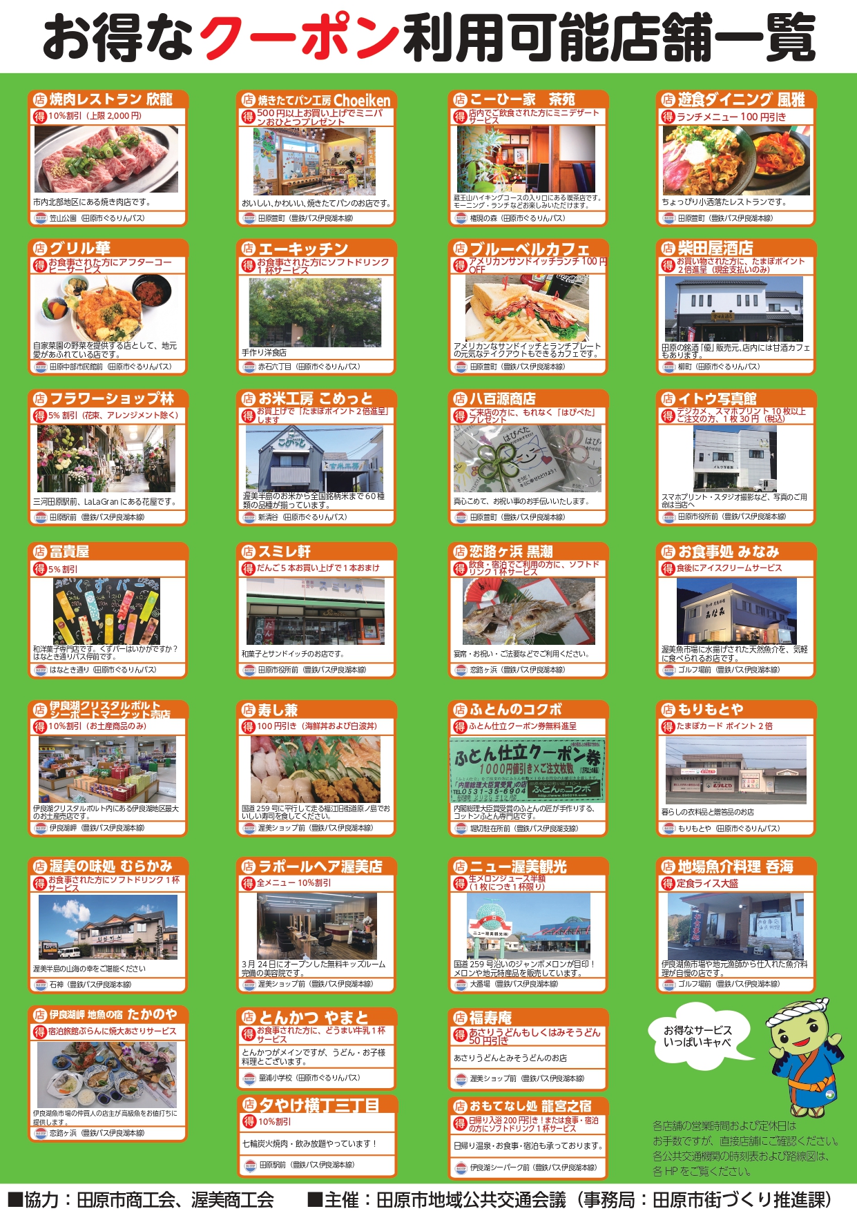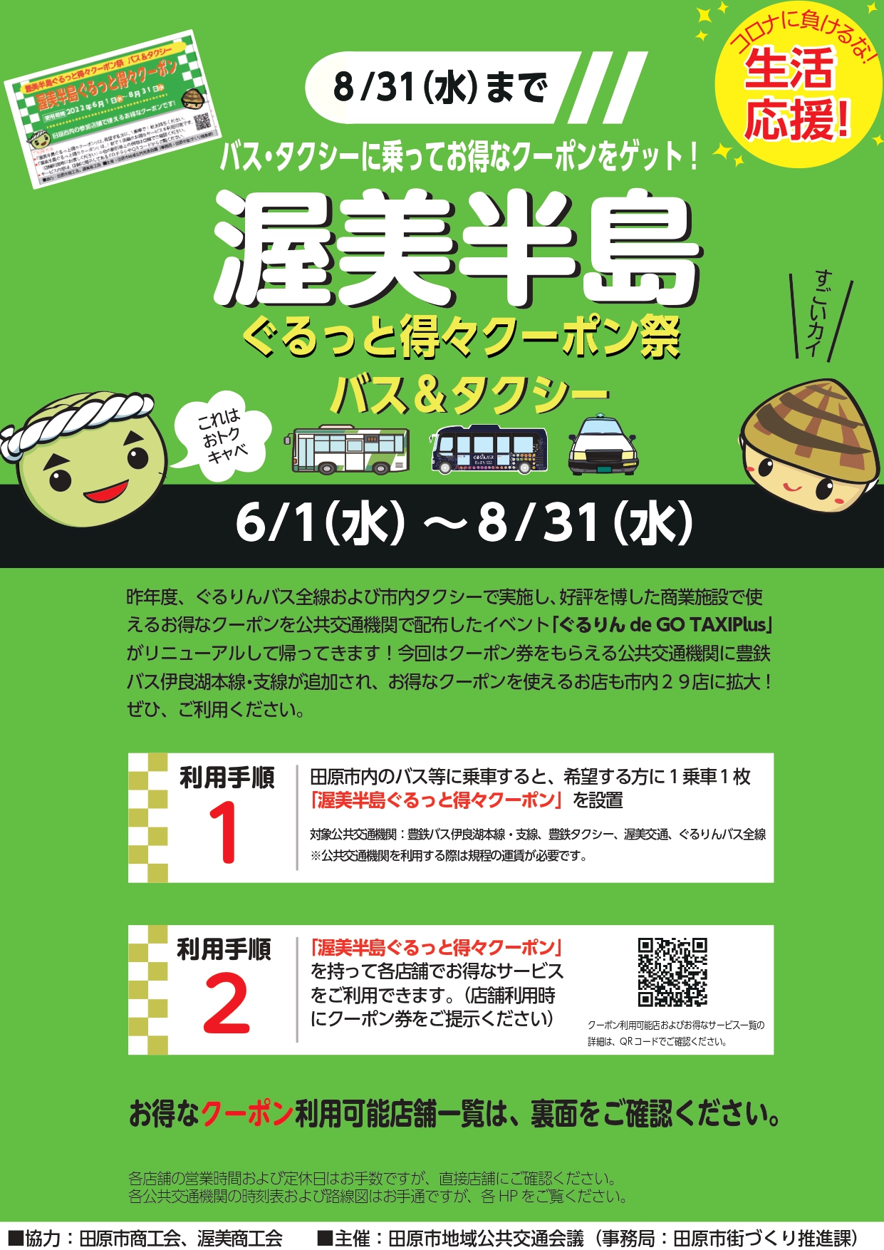 豊鉄バス伊良湖本線・支線、田原市ぐるりんバス、市内タクシーに乗車の方にお得なクーポンを1乗車1人1枚配布します。