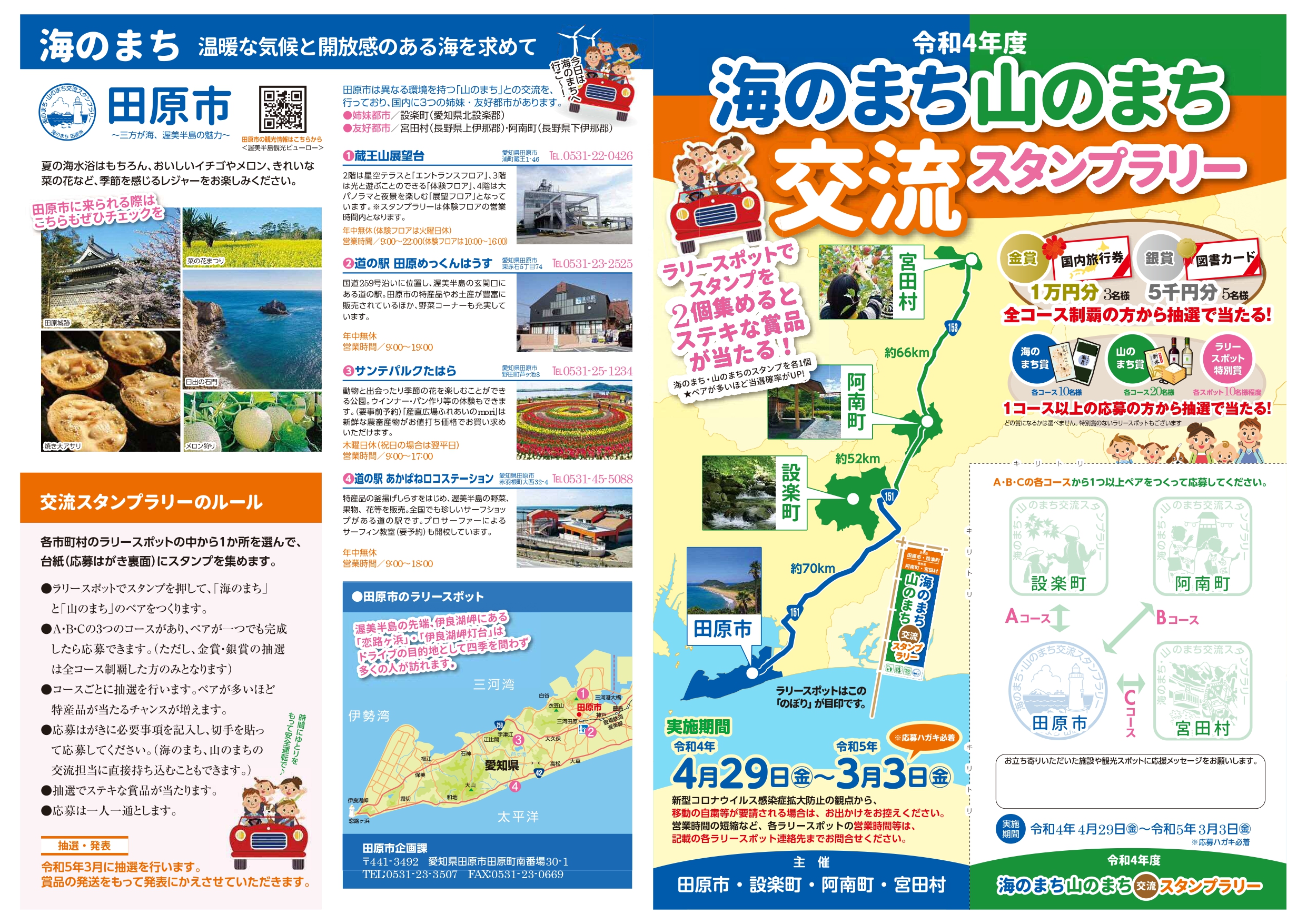 | 応募方法 | 応募用紙に「海のまち」と「山のまち」から各1つ以上スタンプを集め、 必要事項を記入のうえ、田原市役所企画課まで直接または郵送 |