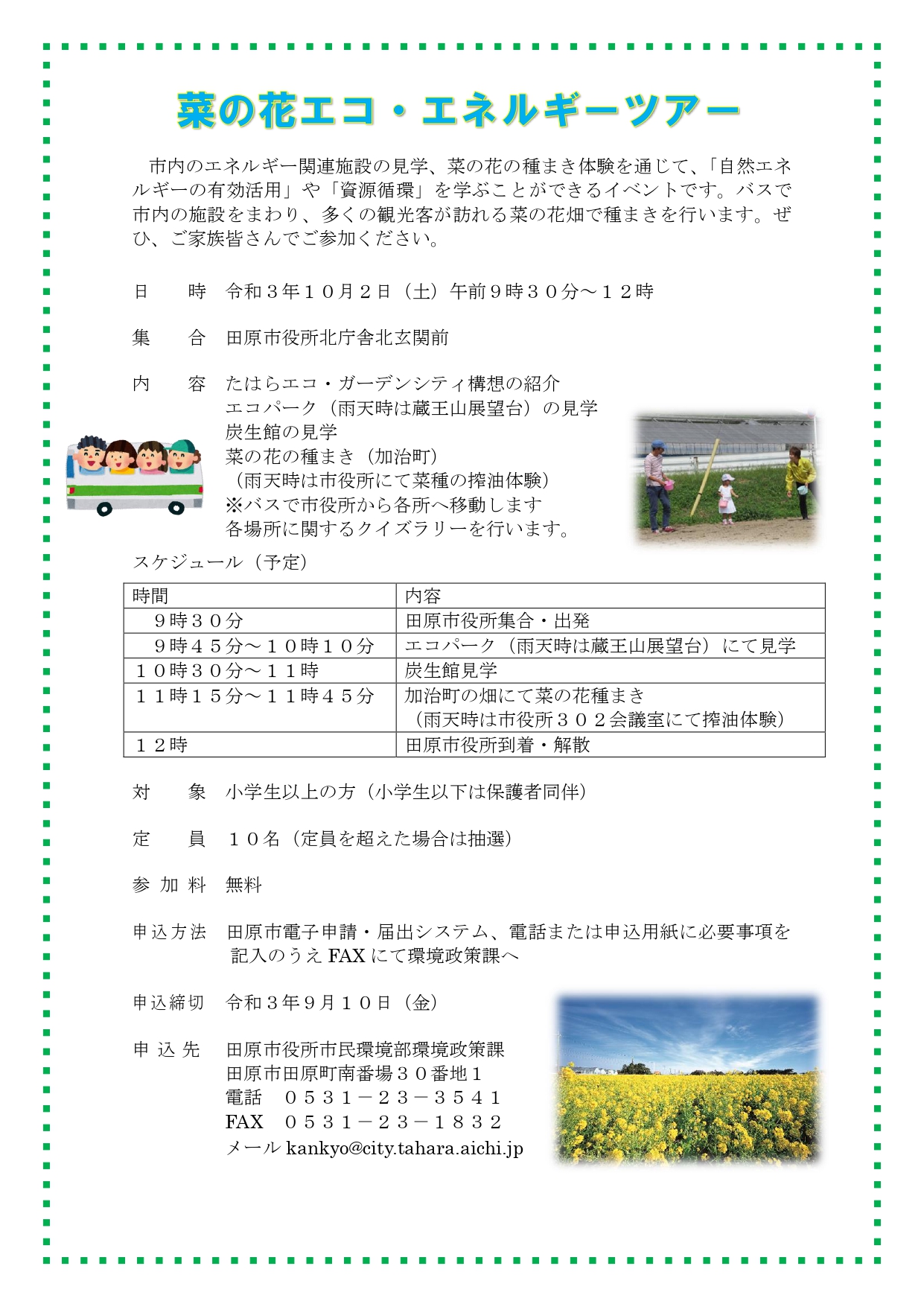 市内のエネルギー関連施設の見学、菜の花の種まき体験を通じて、「自然エネルギーの有効活用」や「資源循環」を学ぶことができるイベントです。バスで市内の施設をまわり、毎年多くの観光客が訪れる菜の花畑で種まきを行います。
