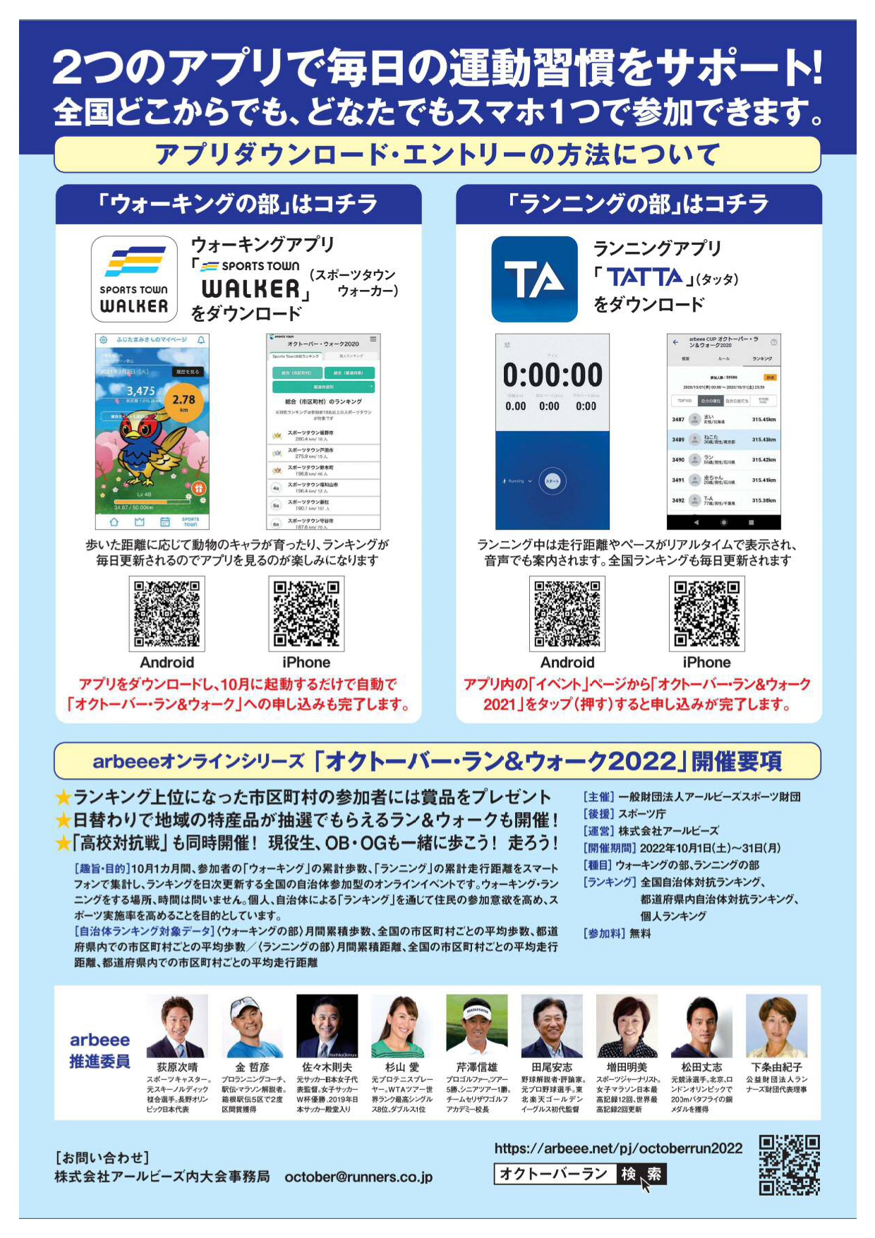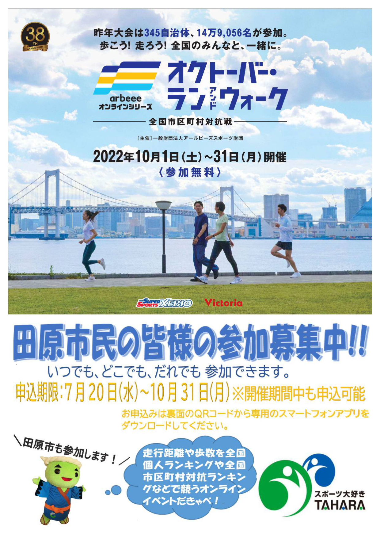 走行・歩行距離を全国個人ランキングや全国市区町村対抗ランキングなどの様々なランキングで競うオンラインイベント「オクトーバー・ランアンドウォーク2022」の参加者を募集します。