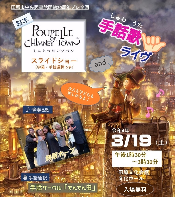 田原市中央図書館開館20周年プレ企画。字幕・手話通訳付きのスライドショーの上演と手話歌を楽しみます。大人も子どもも楽しめます!