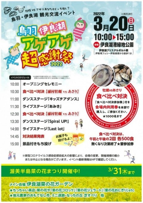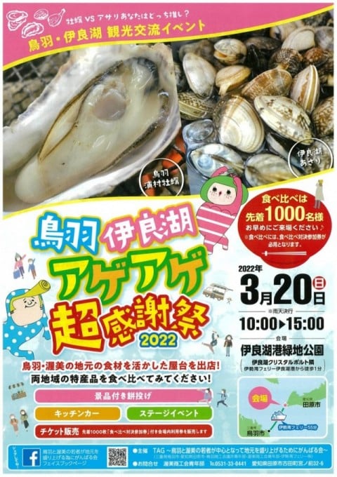 鳥羽伊良湖航路で結ばれた田原市と鳥羽市が、観光交流による両地域の活性化を目的とし、あさり汁と牡蠣の食べ比べや両市特産品の販売、ステージイベント、餅投配布など、一日中楽しめるイベントを開催します。