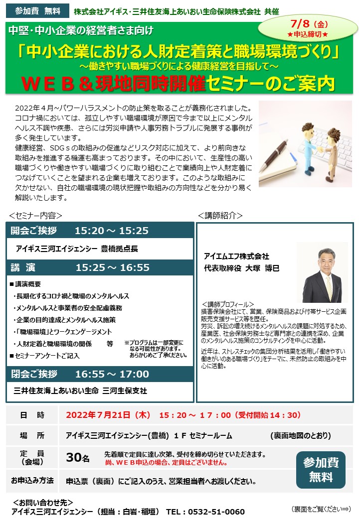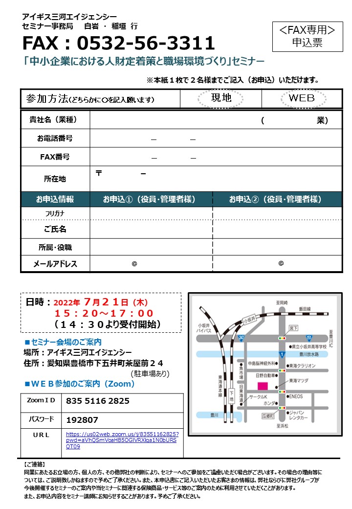 | 場所 | アイギス三河エイジェンシー(豊橋) 1F セミナールーム 愛知県豊橋市下五井町茶屋前24 ※ZOOM URLはチラシをご確認ください。 |