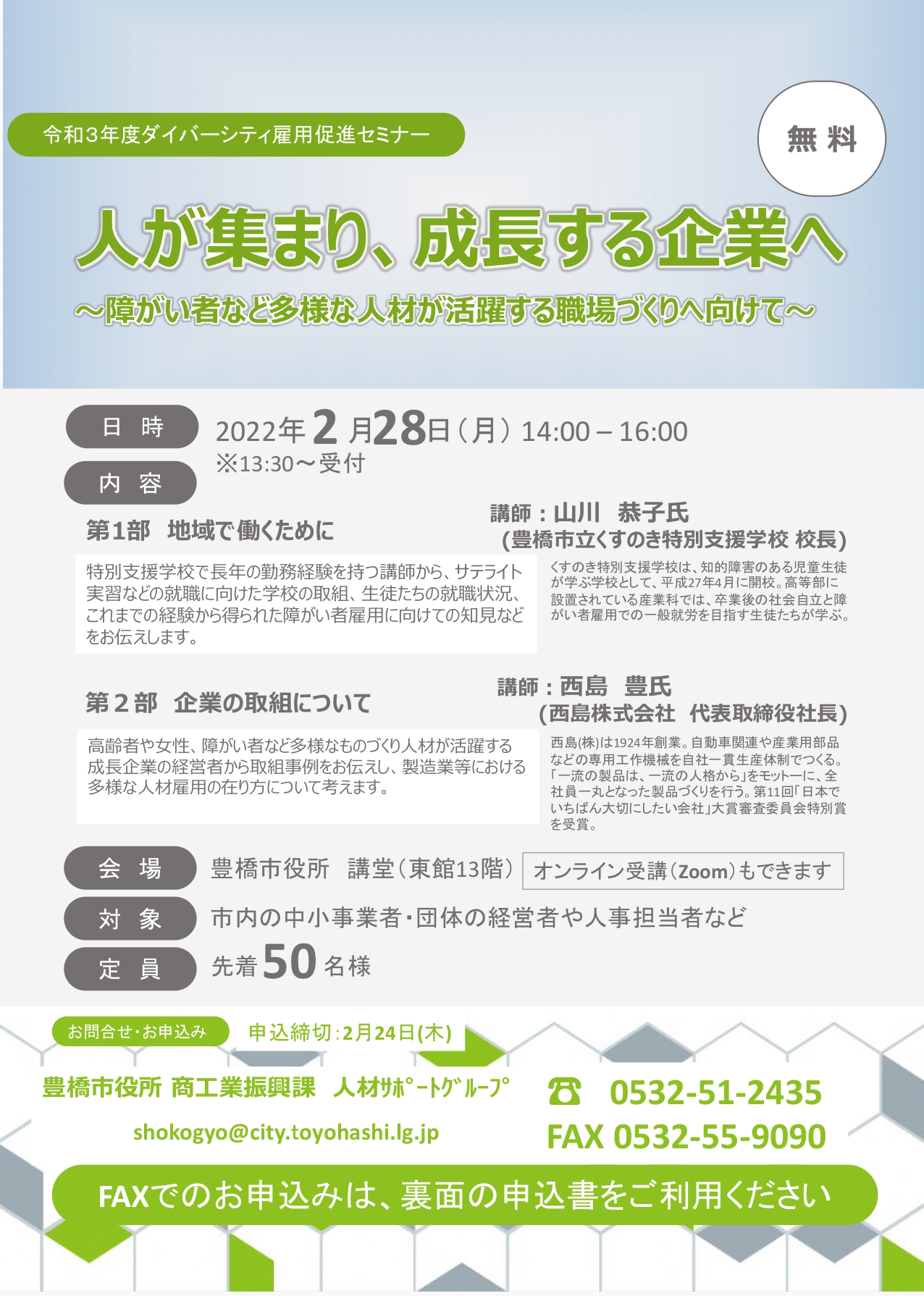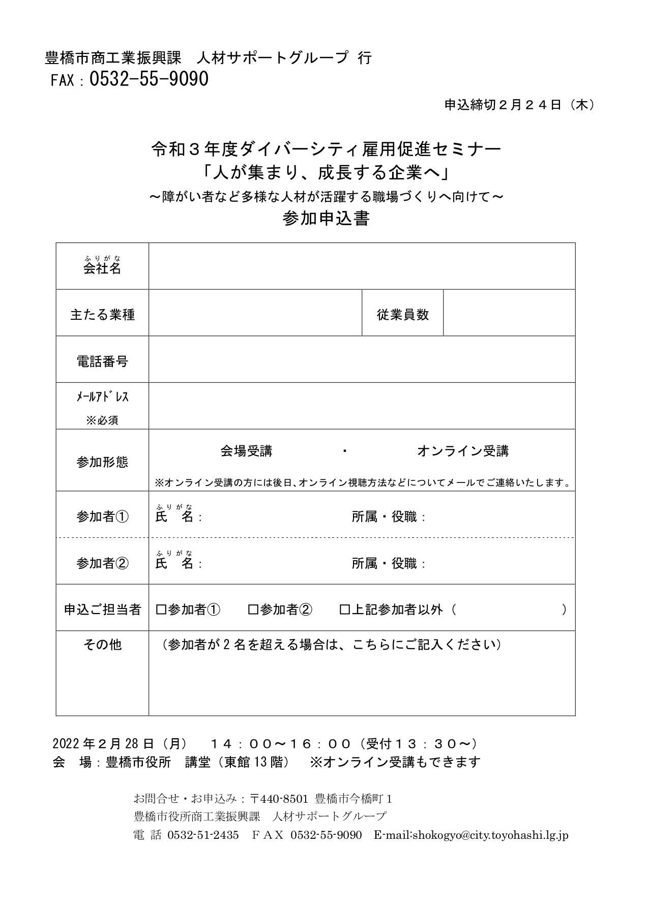 | 対象 | 豊橋市内に事業所を有する中小事業者、中小企業団体の経営者及び人事担当者など |